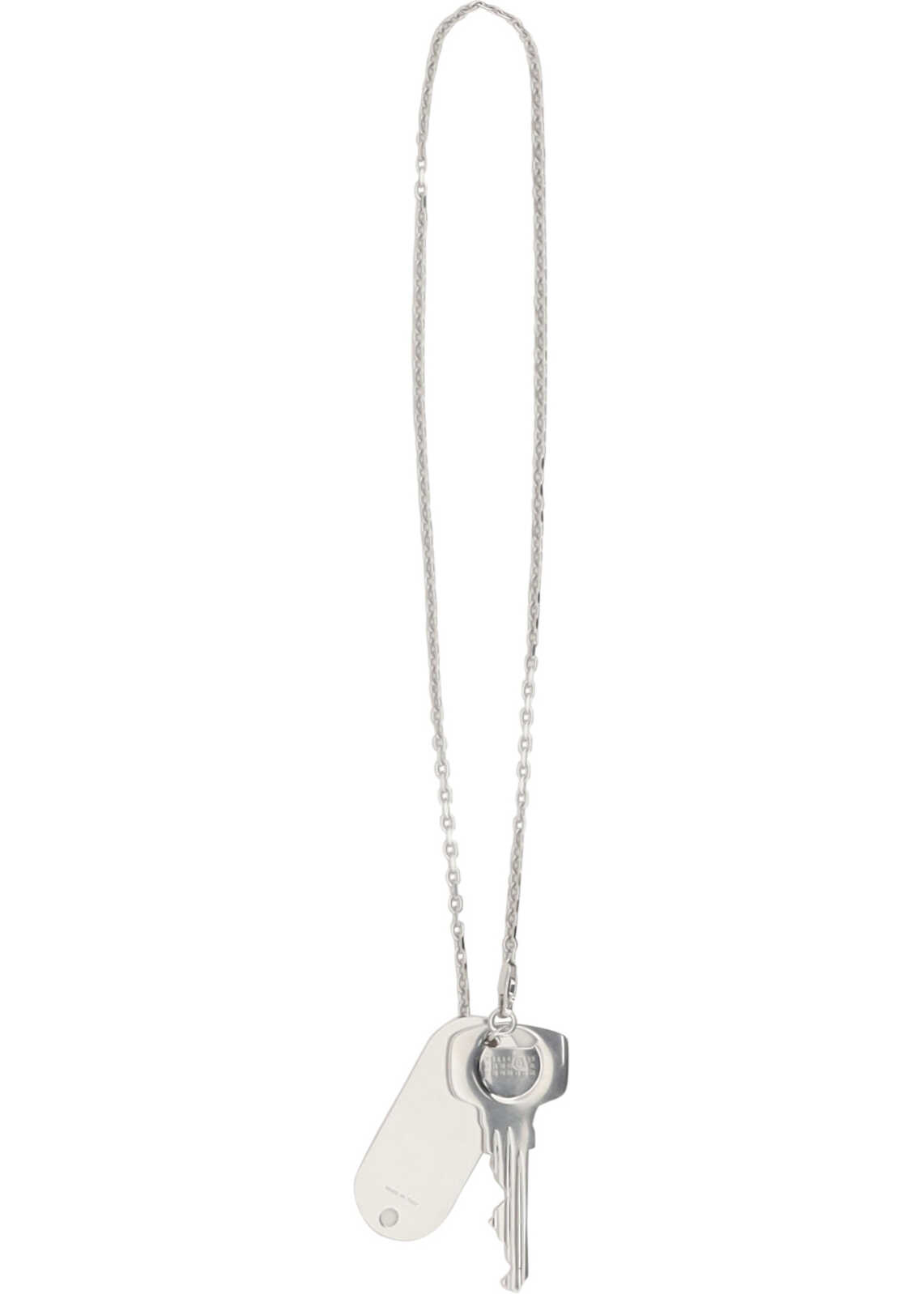 The Key Pendant Necklace from MM6 features a sleek chain link and a lobster clasp closure. The pendant is accompanied by a plaque with the brand's iconic logo, adding a distinctive and modern touch to the design.
