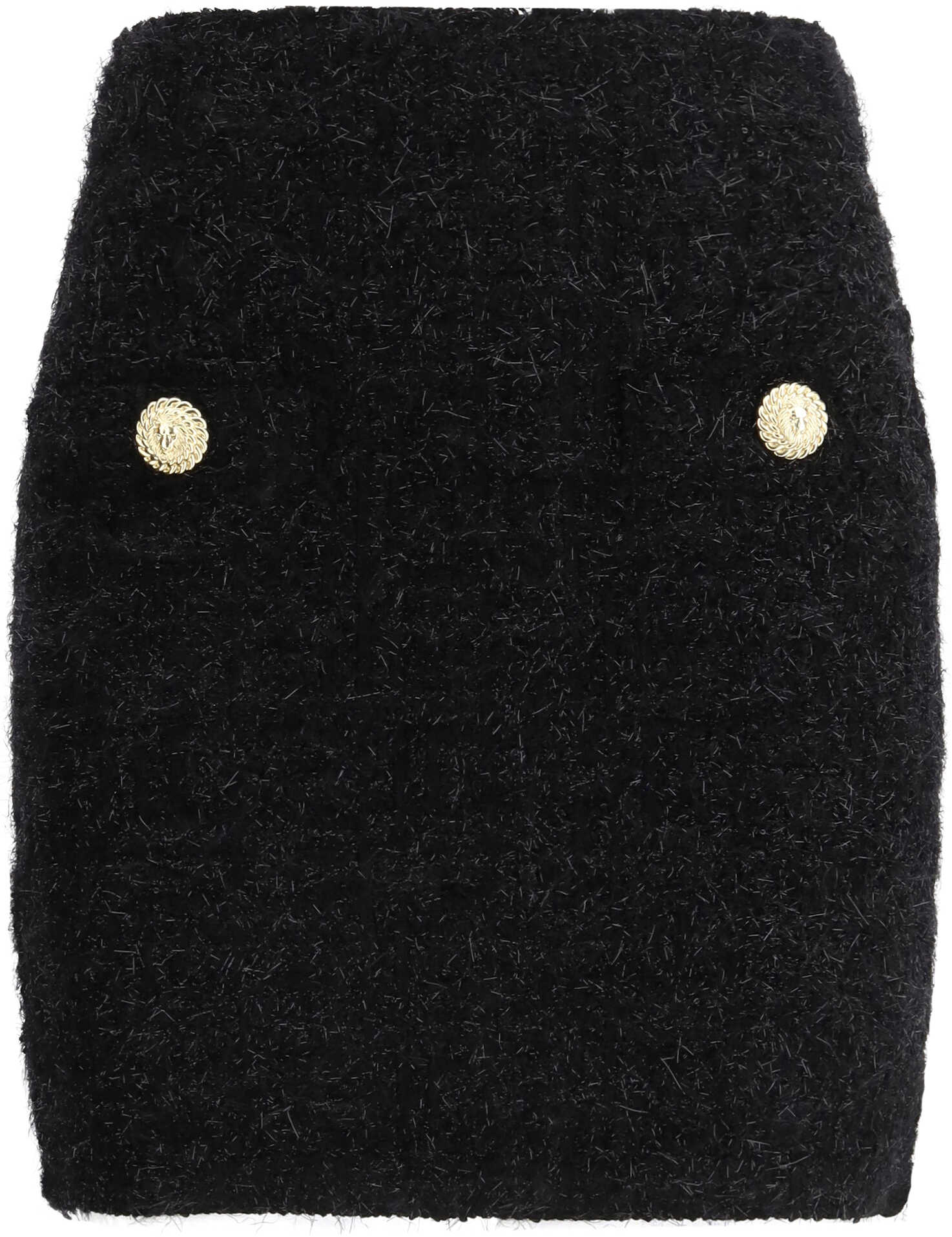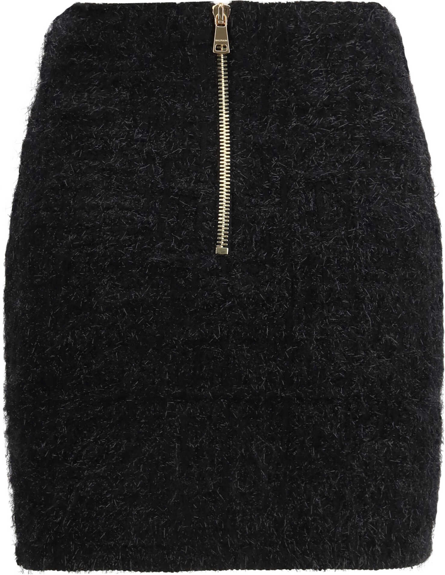 Lurex-Detailed Knit Miniskirt by Balmain features a zipper closure on the back panel, providing a secure and modern fit. Two buttons with the iconic lion's head are applied to the front, adding a distinctive and sophisticated touch. The fitted fit enhances the silhouette, making this mini skirt an elegant and bold piece, ideal for a chic and contemporary look.