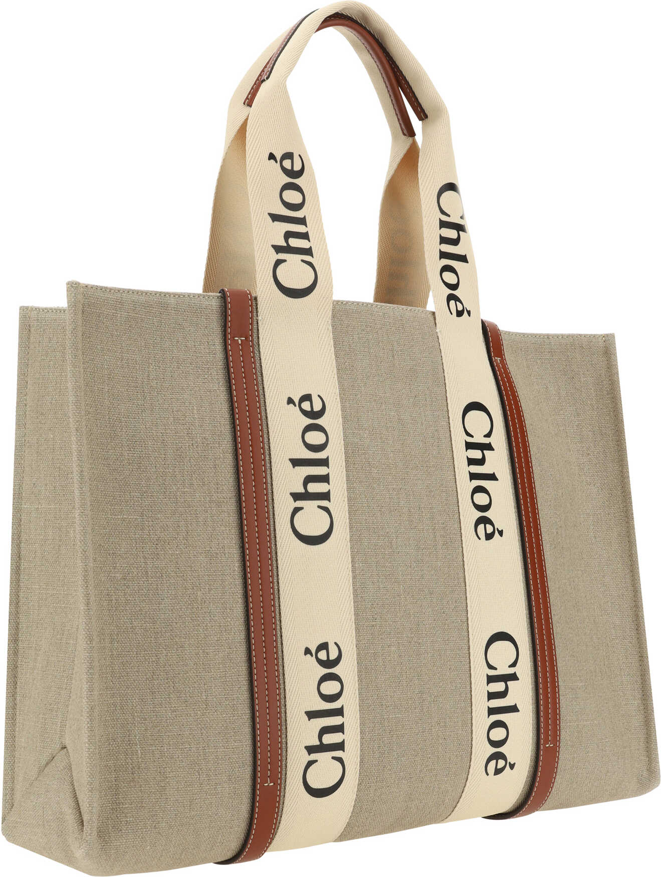 Linen Woody Handbag by Chloé, two flat top handles, appliqué handle extensions on bag panels, iconic brand monogram printed in contrast on handles, interior flat pocket, leather trim.