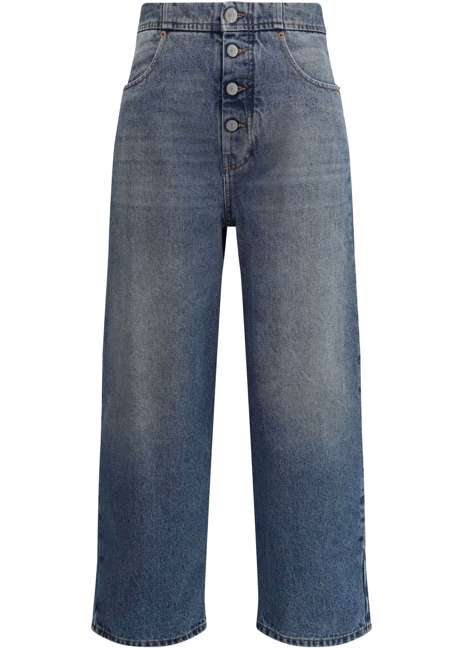 MM6's Jeans are a modern and versatile item, perfect for a casual-chic look. They feature a front button closure, which adds a touch of originality over the traditional zipper. The cropped style offers an ankle length, ideal for highlighting shoes, while the high waist defines the figure, creating a sleek and elegant silhouette. The five-pocket design is practical and timeless, adding a touch of functionality and style.