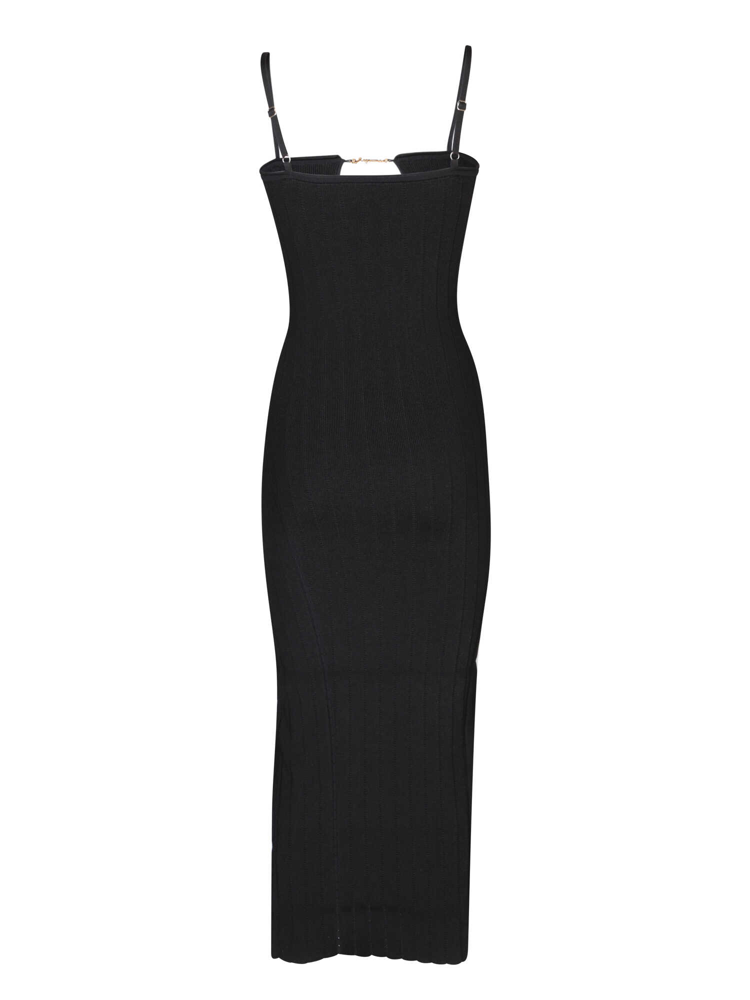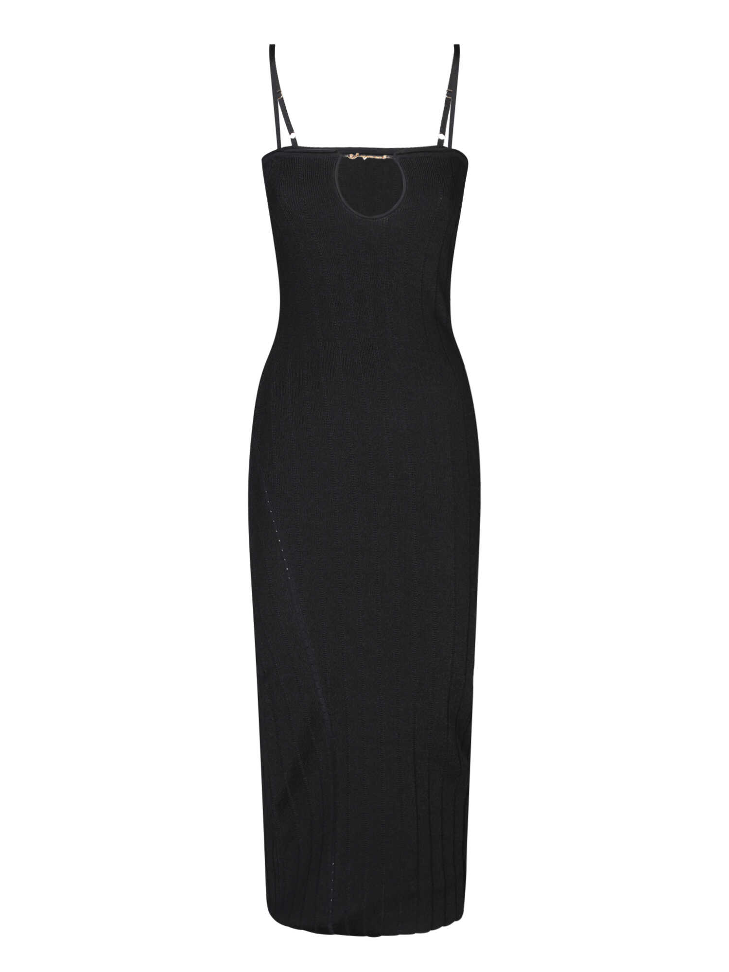 Elevate your style with this stunning black dress from JACQUEMUS. Made from a luxurious blend of 88% Viscose and 12% Polyester, this sleeveless dress features intricate cut-out charm details on the front for a bold and chic look. Perfect for any occasion, this dress offers a tight-fitting effect that will flatter your figure. Make a statement in JACQUEMUS Black Dresses.