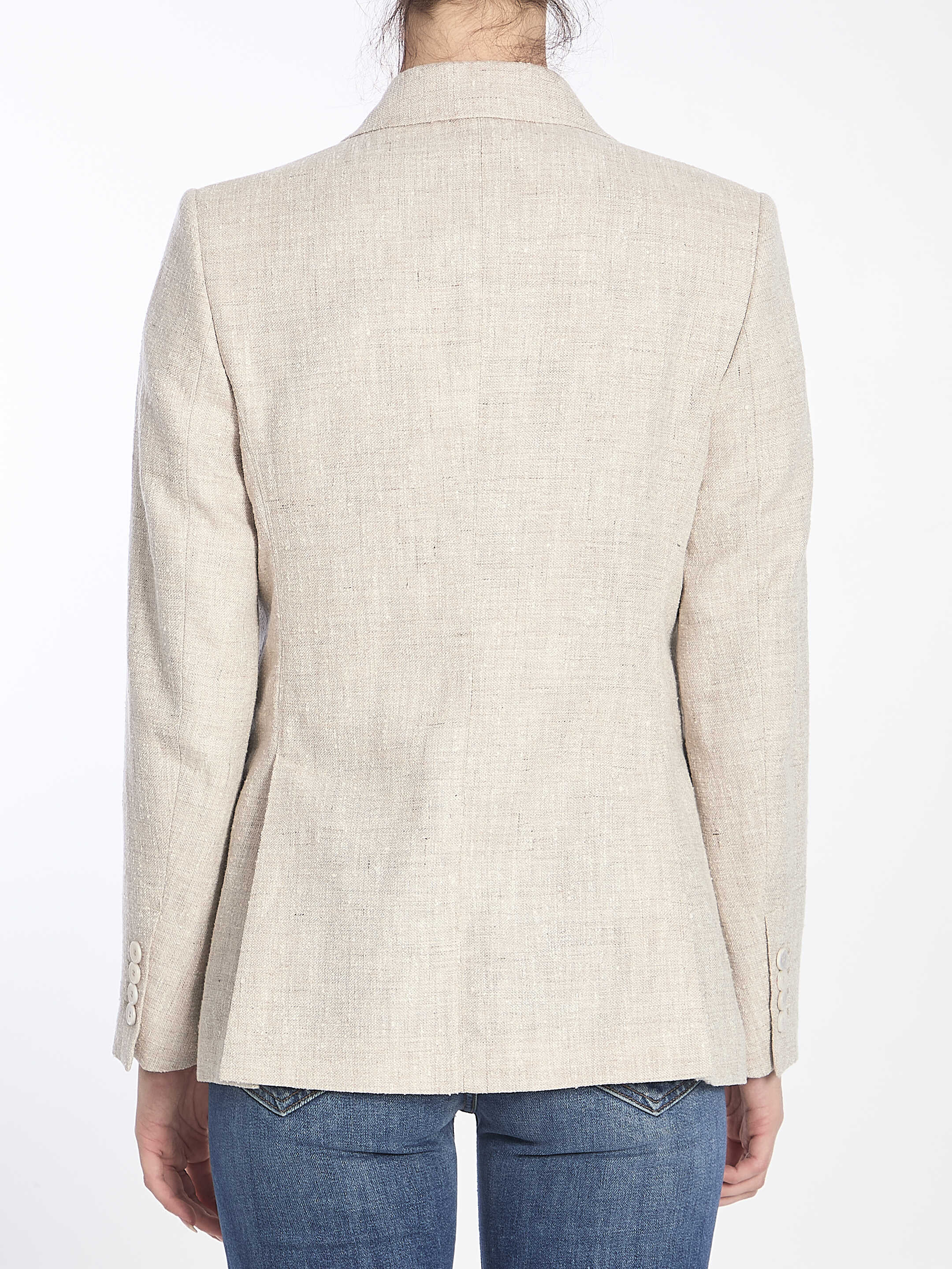 Double-breasted jacket in a sand-colored linen blend. It features six buttons, two front pockets, a chest pocket, classic lapels, four-button cuffs, and a double vent at the back. Protective case included.