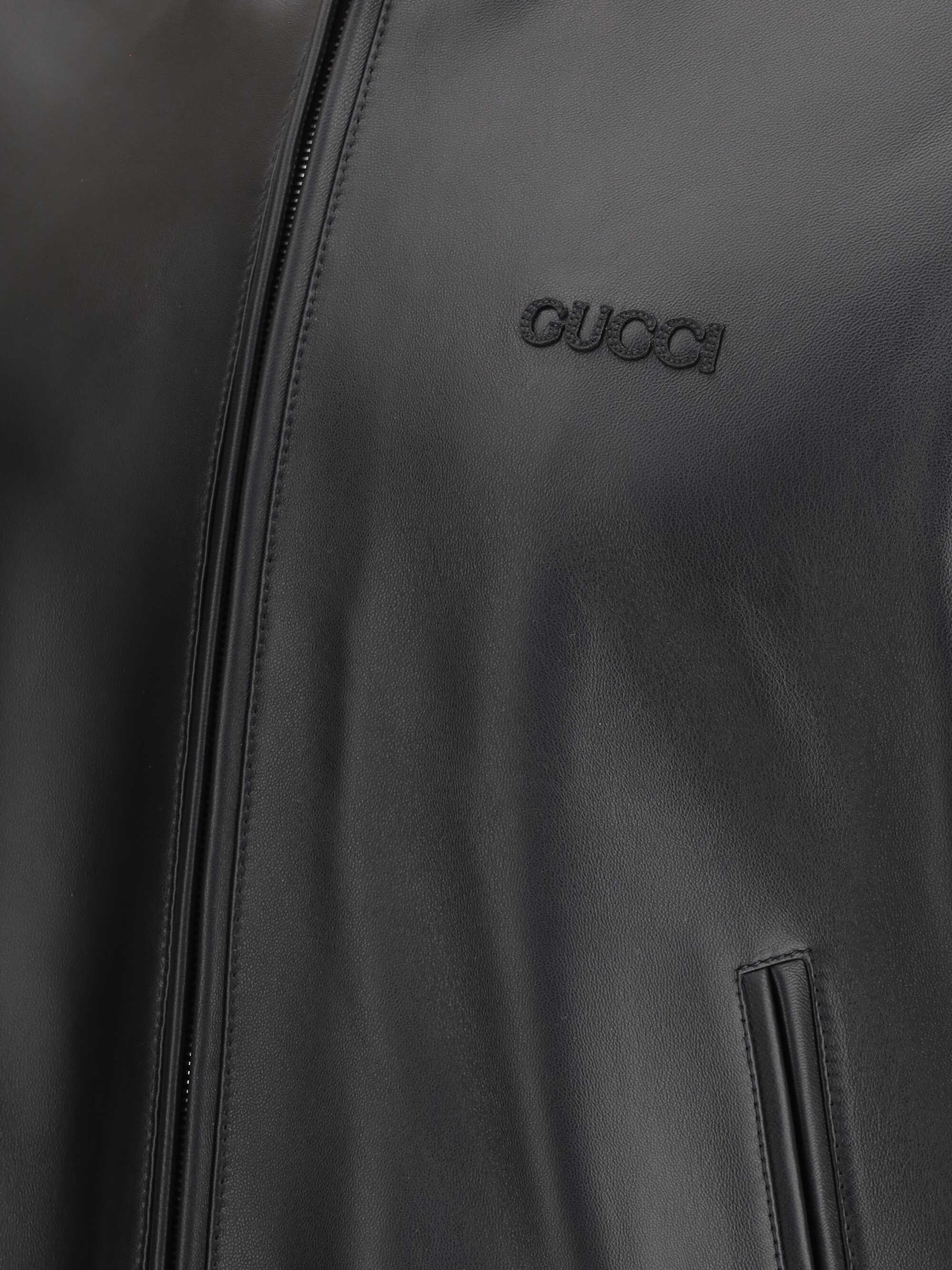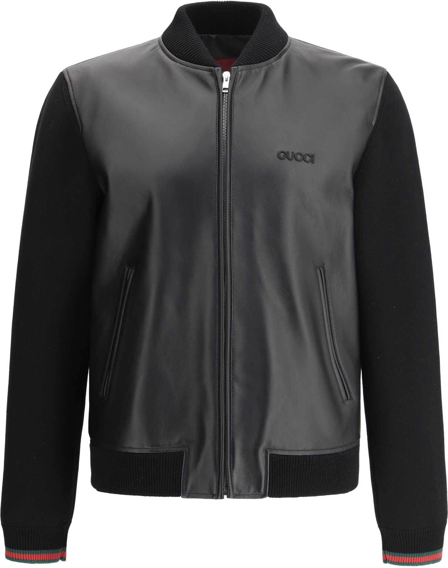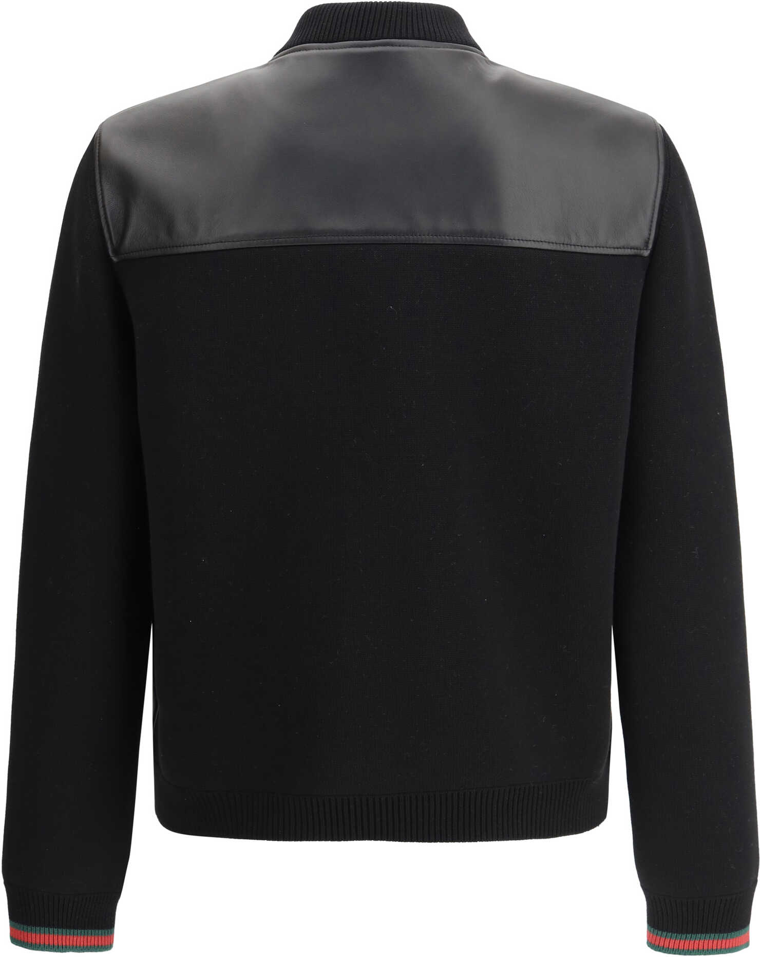 Gucci's leather bomber jacket features a front zipper closure, while the collar and hem are ribbed knit for a soft, comfortable feel. Knit sleeves add a dynamic contrast to the leather, creating a sleek and modern mix of materials. Ribbed cuffs are embellished with colorful bands, the brand's iconic symbol, echoing Gucci's distinctive style. The brand's iconic monogram is stitched tone-on-tone on the front, adding a subtle but recognizable detail. A garment that combines sophistication and sportiness in a sophisticated way.