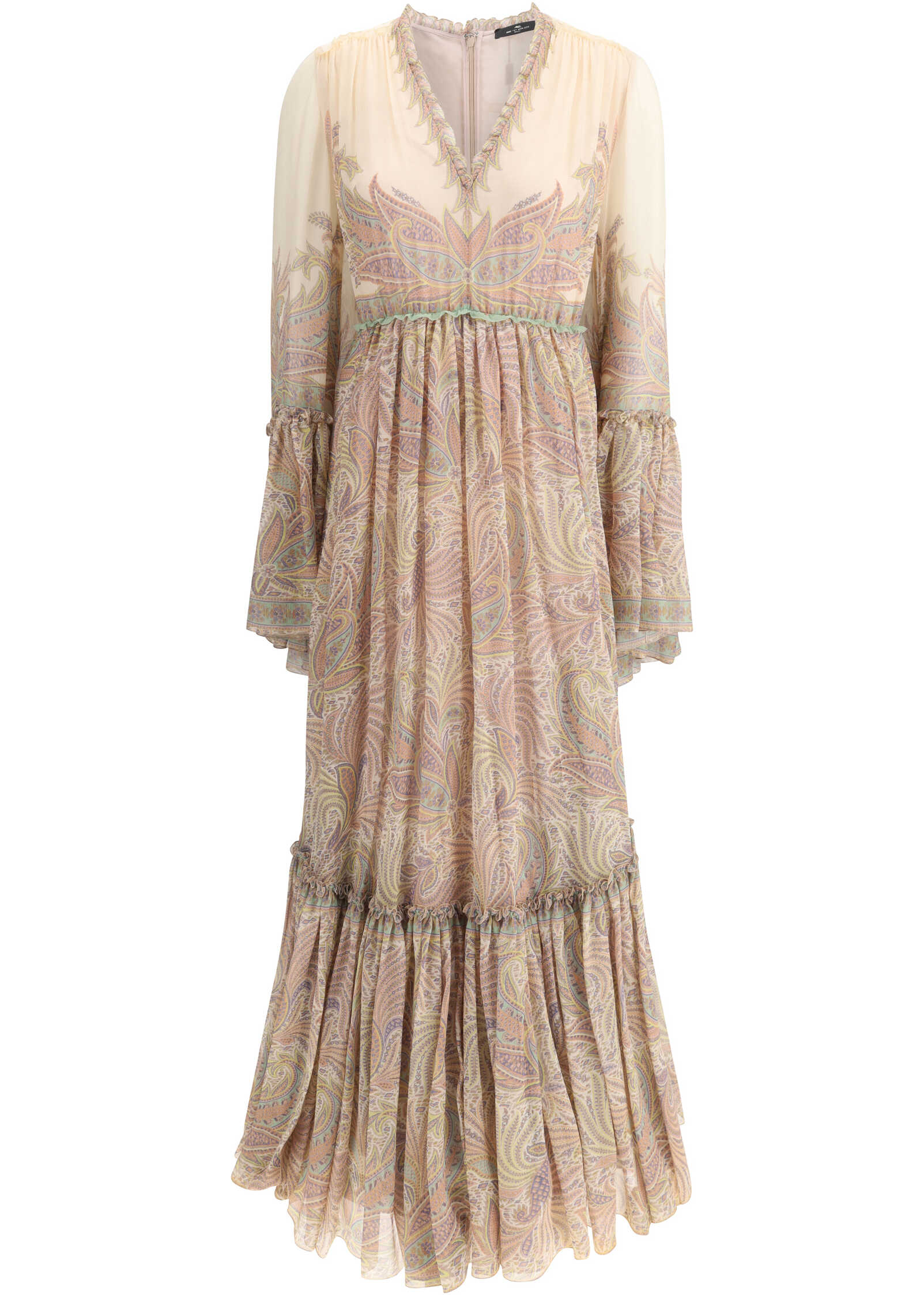 Etro's Silk Floral Print Long Dress is a masterpiece of elegance and freshness, perfect for special occasions or sophisticated events. The V-neckline adds a touch of sensuality, while the back zipper closure ensures a secure and comfortable fit. The elasticized waistline emphasizes the silhouette, creating a sleek shape, while the flared skirt gives a fluid and harmonious movement. Tulle inserts add a delicate and sophisticated dimension to the design, creating an ethereal effect. Flared sleeves complete the look with a light, romantic touch. The all-over floral pattern is the real star, giving the dress a vibrant energy and timeless beauty.