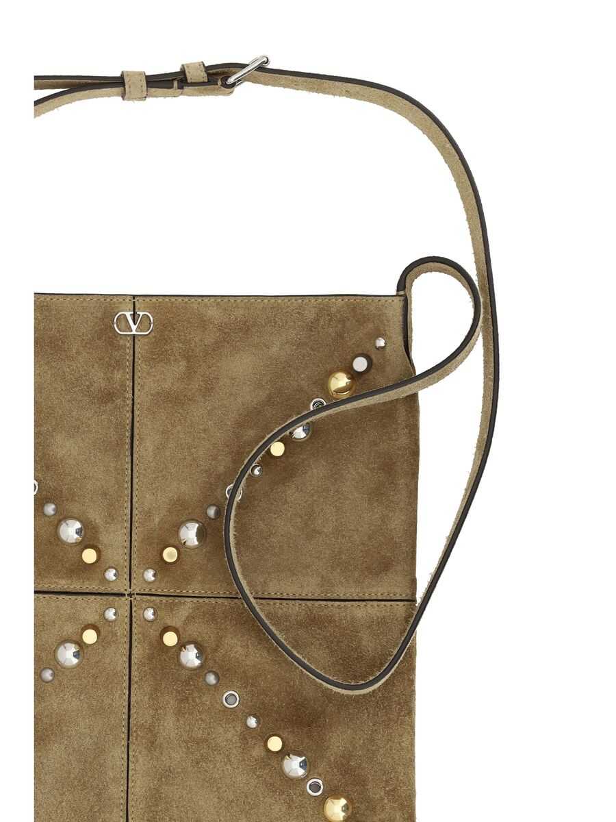 Valentino Garavani shoulder bag crafted in beige suede with studs of various shapes and sizes. It features silver-tone hardware and adjustable shoulder strap. Tone-on-tone suede-lined interior. The design is completed with a front-applied VLogo Signature metal detail and fringe accents at the bottom.