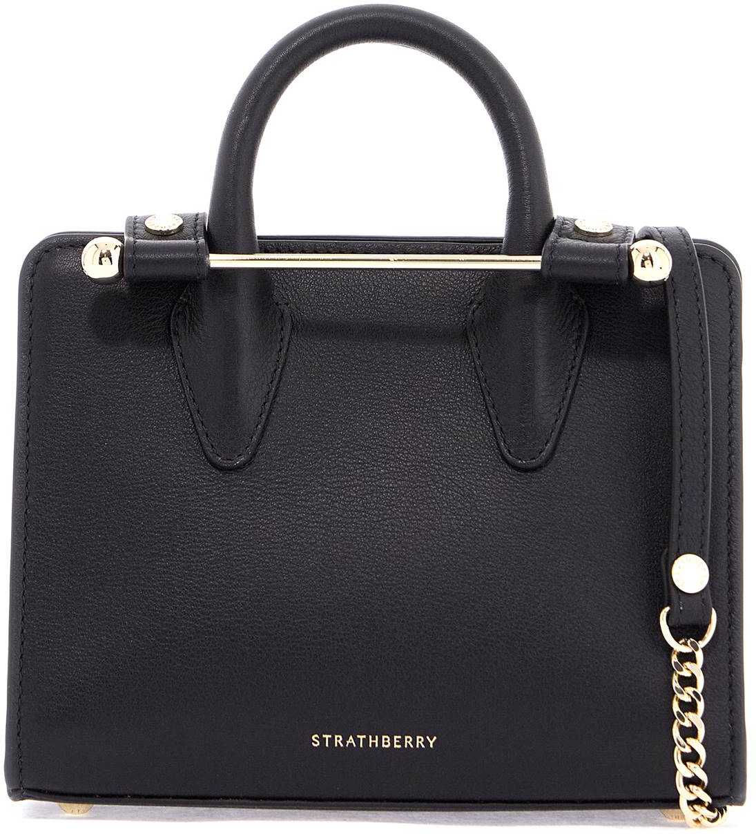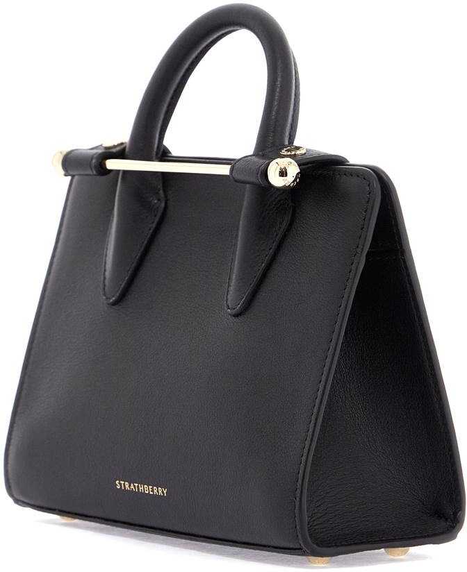 The STRATHBERRY Mini Tote in black calfskin offers Italian elegance and contemporary design. Compact and versatile with a removable shoulder strap, it embodies refinement for every occasion.