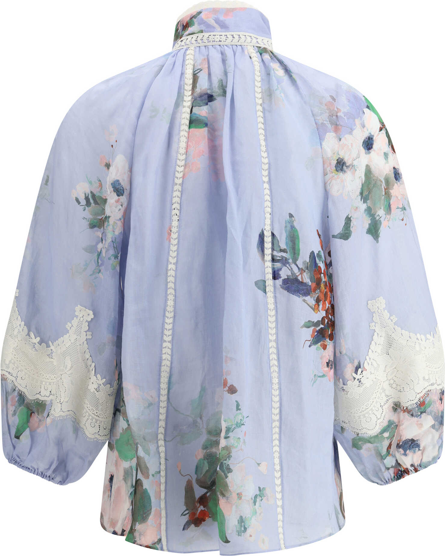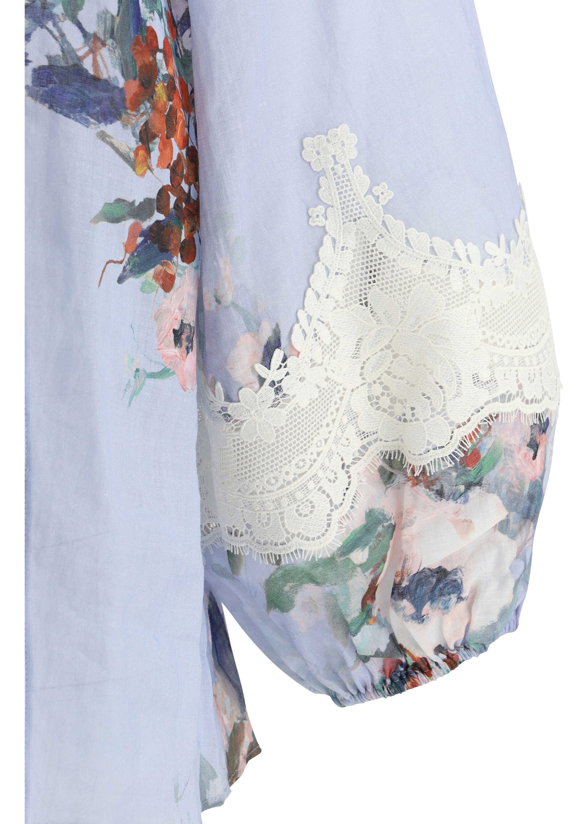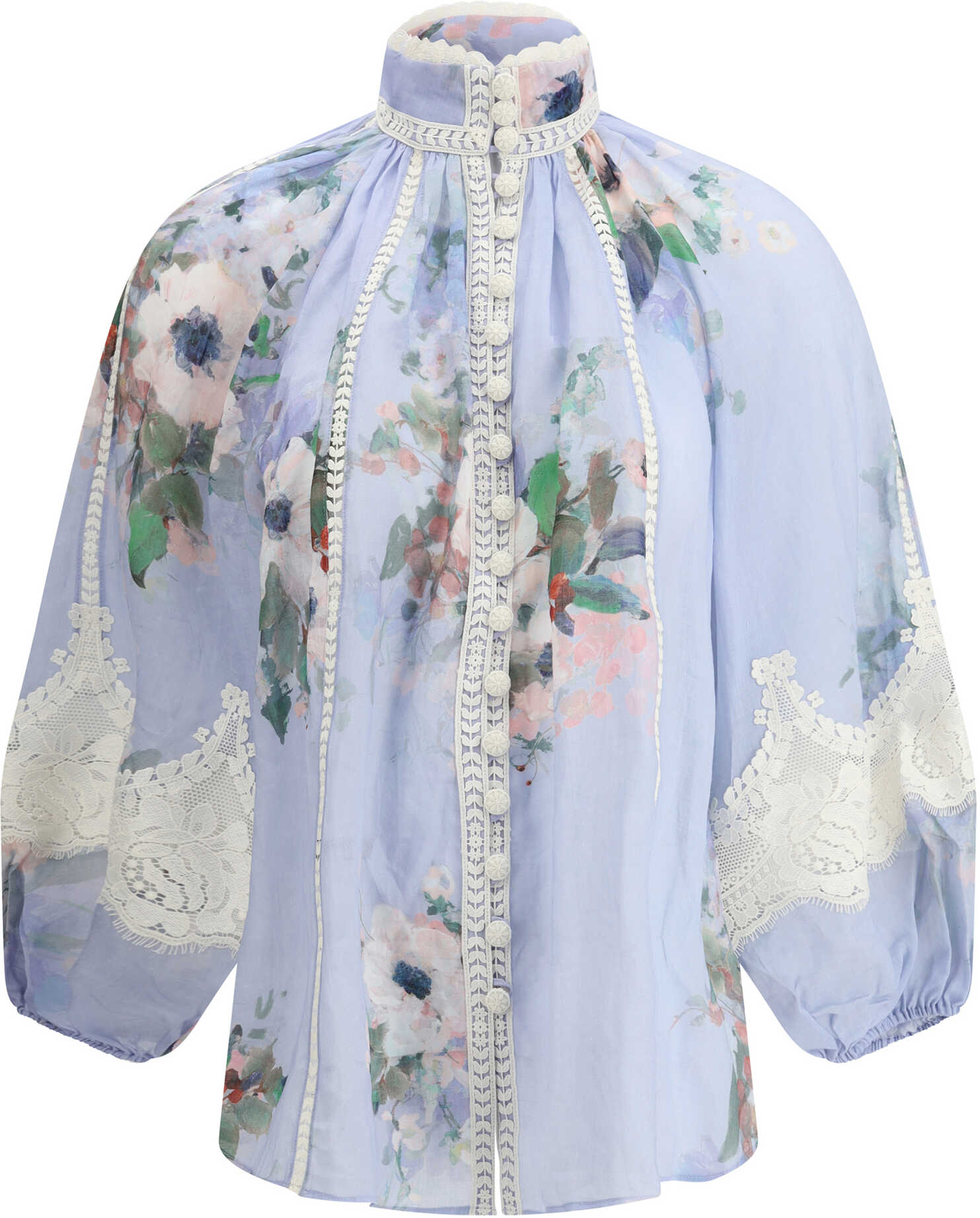 Zimmermann's Everley Lace Blouse is made from high-quality silk, which gives the garment a soft, flowing texture. The design features an elegant high neck and a woven button closure for a refined look. Balloon sleeves give volume and a romantic touch, while elastic cuffs ensure a perfect fit. The floral pattern and lace details on the sleeves and along the hems add freshness and femininity, making this blouse ideal for creating sophisticated and dynamic looks perfect for any occasion.