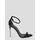 Dolce & Gabbana’s black satin sandals featuring a round toe, DG logo plaque on the ankle strap, leather lining, insole and sole and silver-tone stiletto heel with DG logo on the back.