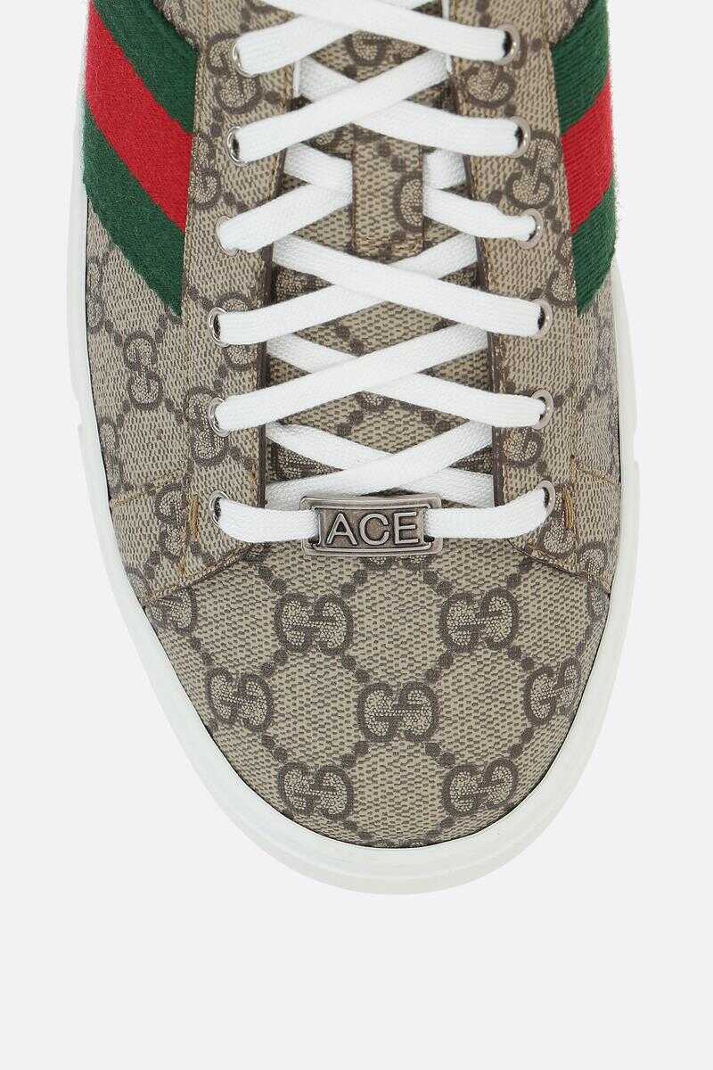 Gucci's low-top sneakers crafted in beige and ebony GG Supreme canvas with green smooth leather details. Featuring lace-up closure, a round-toe silhouette, side Web ribbons, leather lining and rubber sole. The design is completed by the Ace logo plate at front and the lettering logo print at heel. The sneakers come with an additional set of shoelaces.