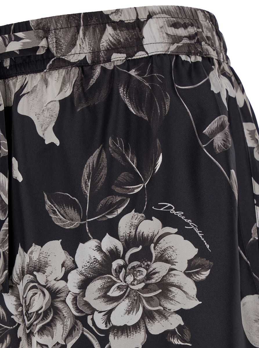 black/white silk all-over floral print pleat detailing elasticated drawstring waistband two side slit pockets rear patch pocket This print was created to be entirely unique and might differ slightly from the item pictured.