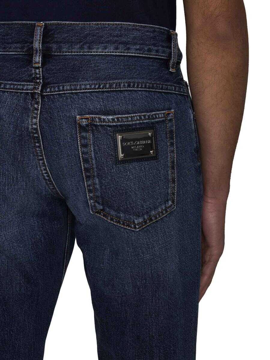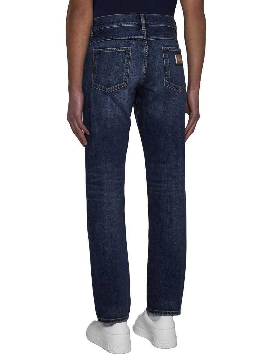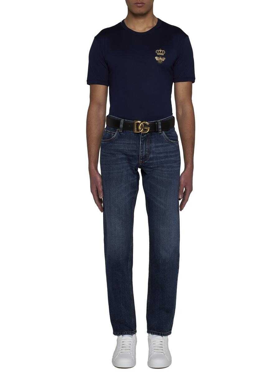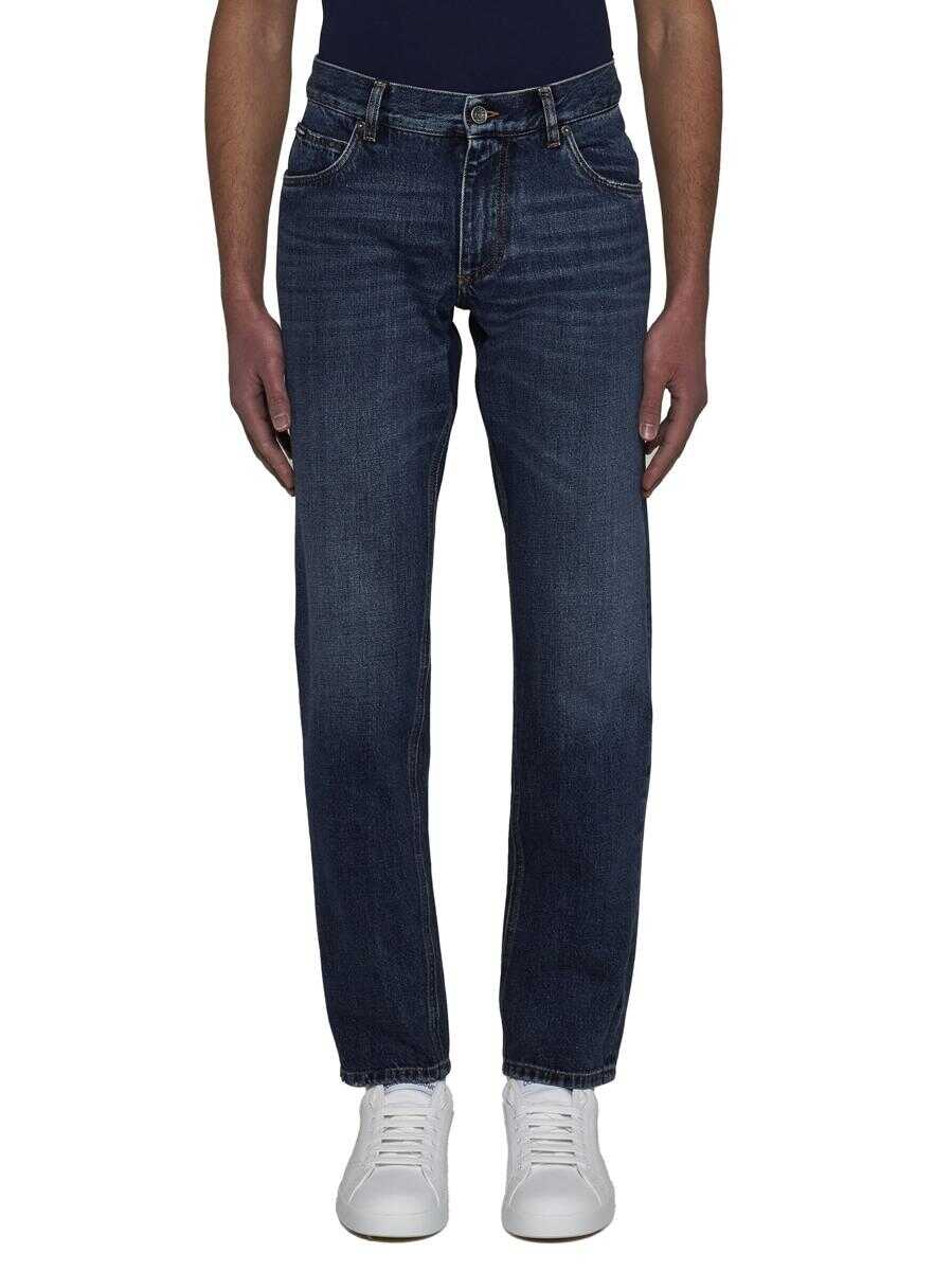 Dolce & Gabbana’s regular-fit straight leg jeans in blue denim featuring belt loops, button and zip fly, five pocket cut and logo plaque on the rear pocket.