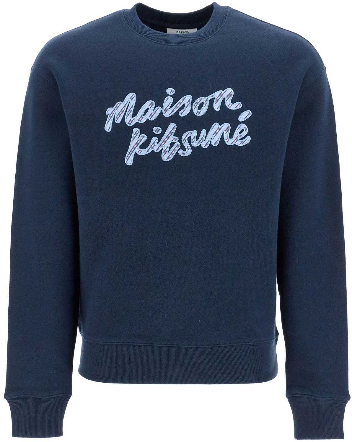 The Maison Kitsuné crewneck sweatshirt offers timeless elegance in navy cotton. Unique design with stylized lettering for casual luxury. Comfort and style merge in this versatile and refined piece.