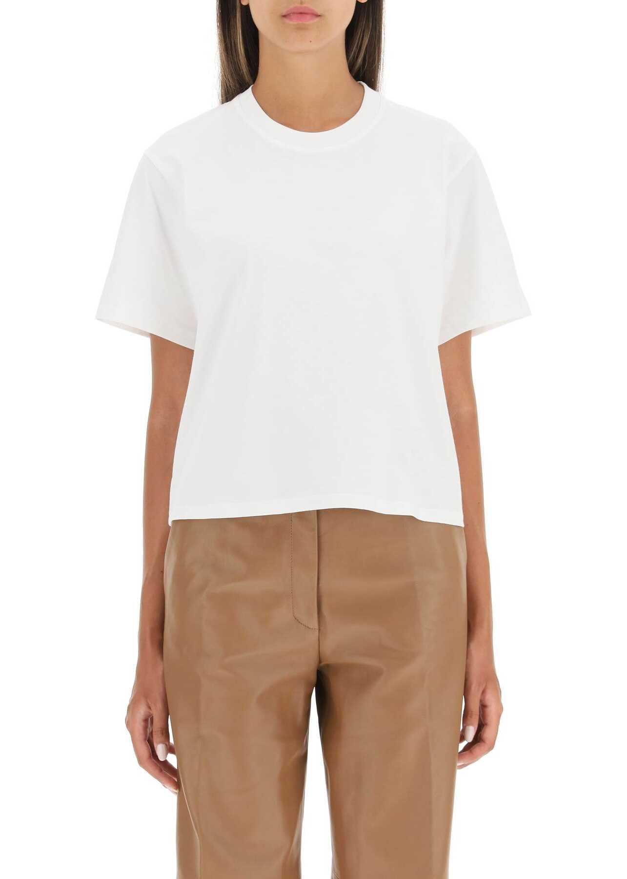 A short-sleeved T-shirt from Loulou Studio in fine Pima cotton jersey, featuring a ribbed crew neck and an in-tone monogram embroidery at the front hem. It comes in a boxy cut for a relaxed fit. The model is 177 cm tall and wears a size XS.