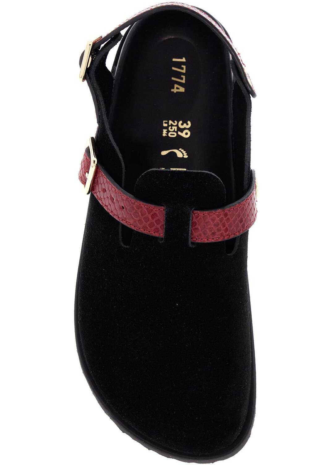 The Tokio II Lined clogs from the Birkenstock 1774 collection are made of suede leather and adorned with adjustable snake print leather straps. They feature an anatomical cork and latex footbed covered in leather, as well as a cut-out EVA sole.
