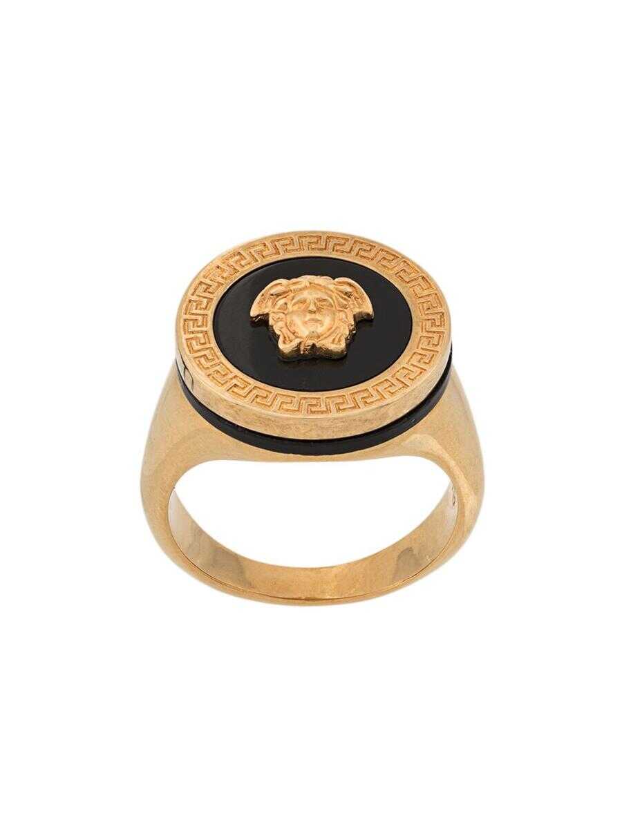 Versace's Medusa ring in metal. Iconic gold Medusa head. Black enamel. Frame with Greek motif. Circular shape. - Versace - Made of metal - Black and gold - Men's - Medusa head