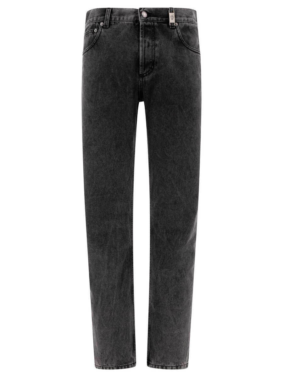 Cotton denim jeans with button closure, five pockets, leather logo tag, metal plaque on the belt loop