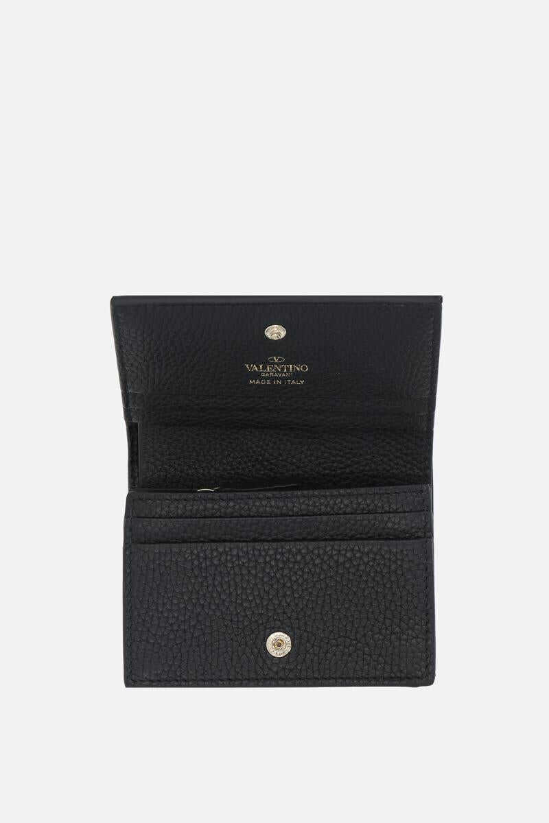 Valentino Garavani's flap wallet crafted in black grained leather adorned with signature platinum-tone metal studs. Fabric / leather-lined interior with zip coin pocket, bill compartment, slip pocket and five card slots. The design is completed by the unmistakable embossed logo at back.