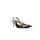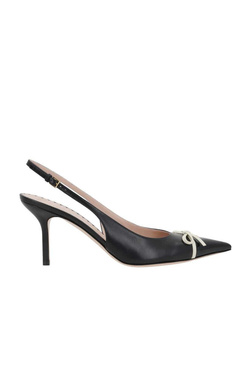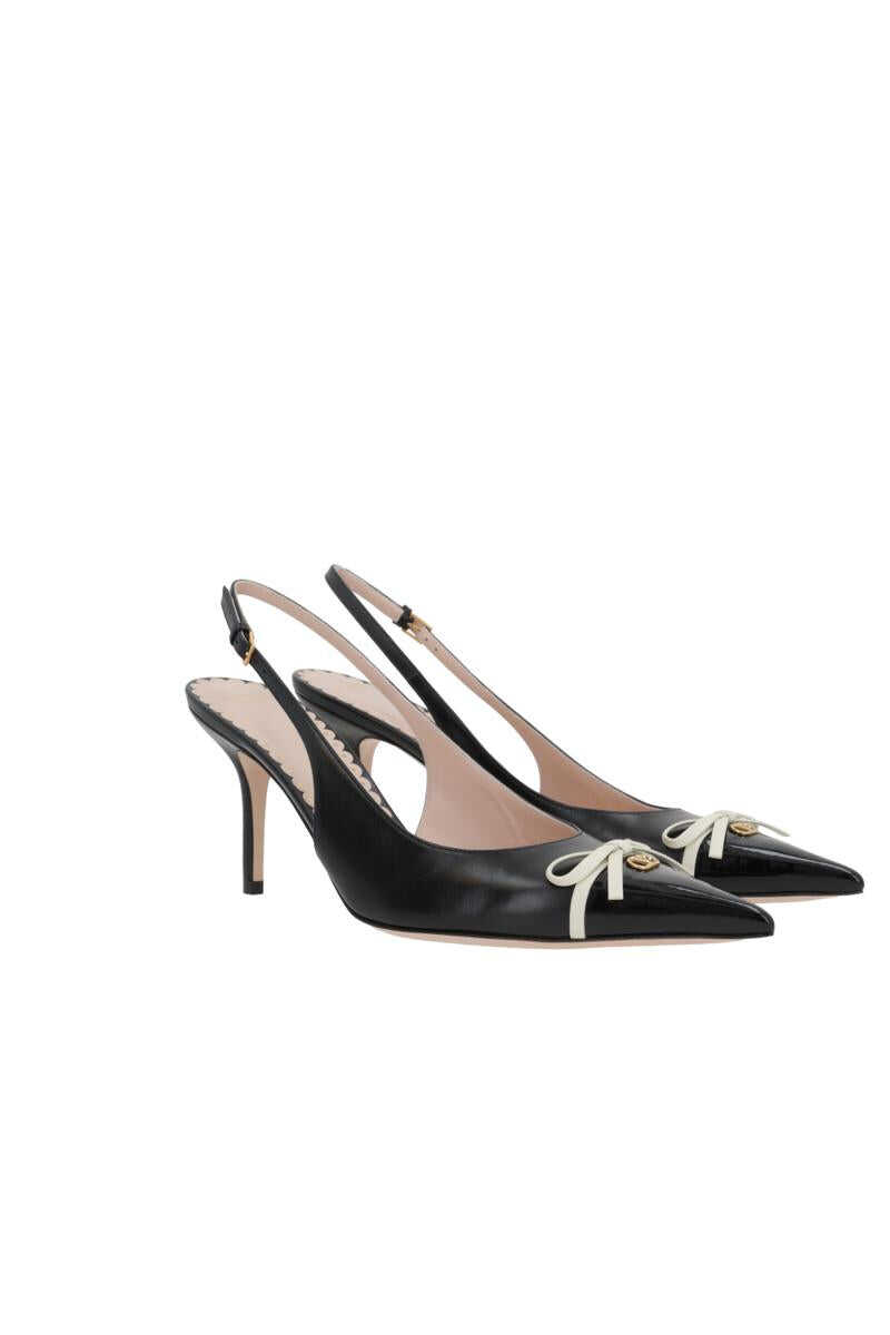 Valentino Garavani slingbacks crafted in smooth black leather. Features an adjustable ankle strap with metal buckle, a pointed patent leather toe with a gold-tone metal VLogo Signature detail and decorative bow, leather lining and a leather sole. The design is completed with a covered midi heel.