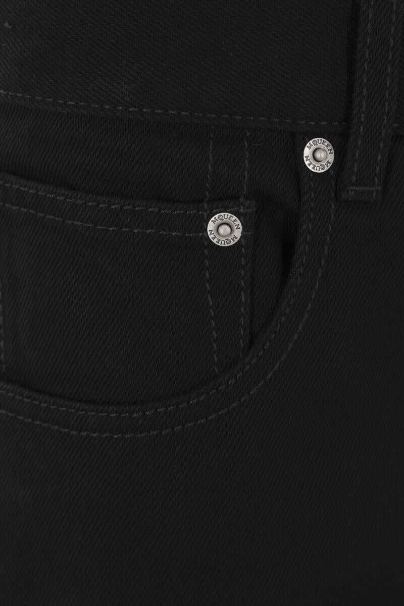 Alexander McQueen straight-leg jeans crafted in black cotton denim. Featuring a front metal button closure, belt loops with a metal Skull plaque, five classic pockets, and a logo patch on the back.