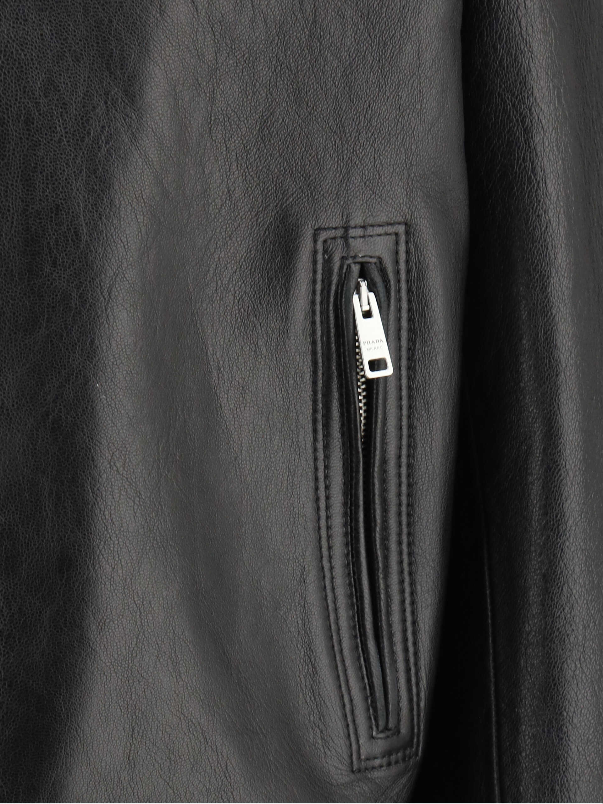 Prada's Biker Leather Jacket combines a bold and sophisticated design. The snap-button front closure offers practicality and clean styling. Two zippered welt side pockets and a zippered chest pocket add a functional and modern touch, while a zippered sleeve pocket further enhances the garment with useful and stylish details. The classic lapels lend a touch of sophistication, complementing the bold, contemporary look of this leather jacket, ideal for a bold, urban look.