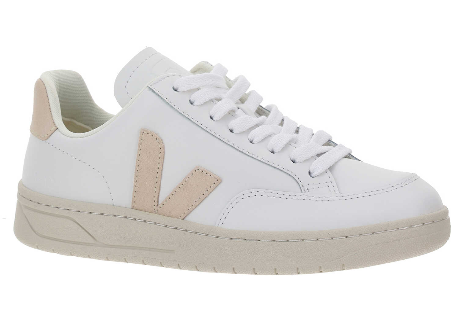 Calfskin V-12 Sneakers by Veja, lace-up front closure, heel counter with contrasting iconic brand monogram, round toe on front, contrasting iconic brand logo on side panels.