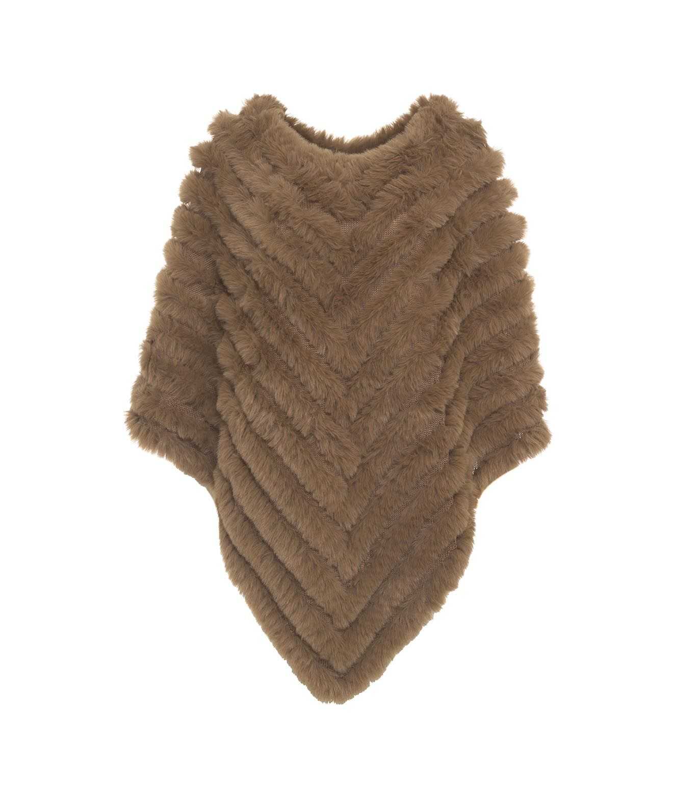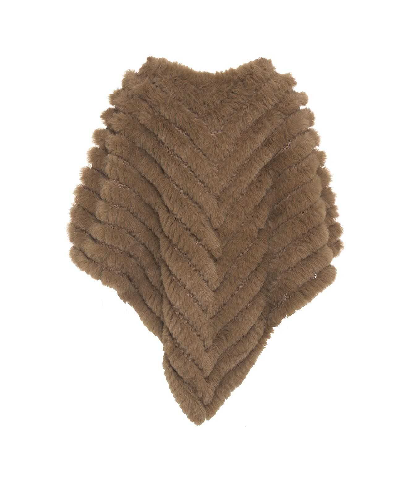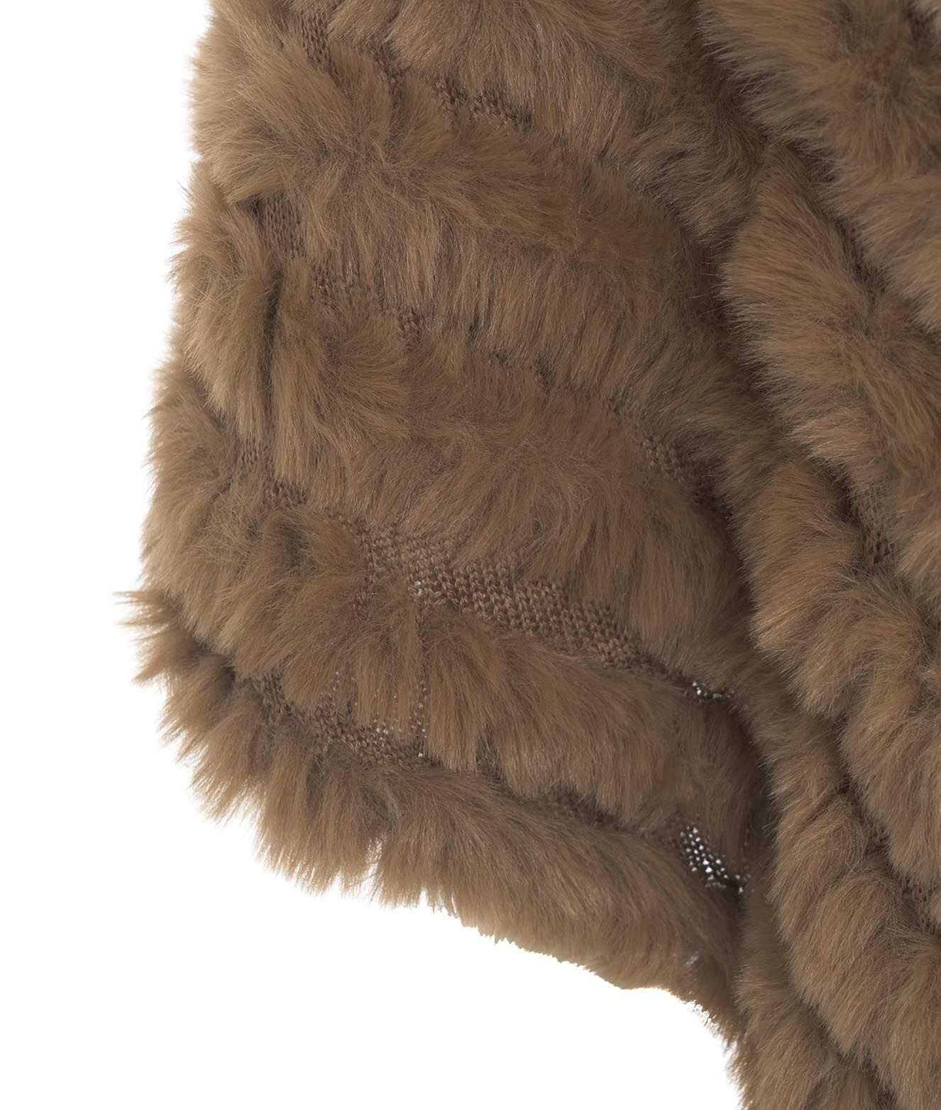 Crew neck, Asymmetrical hem, Knitted textile, Faux fur, Brooch