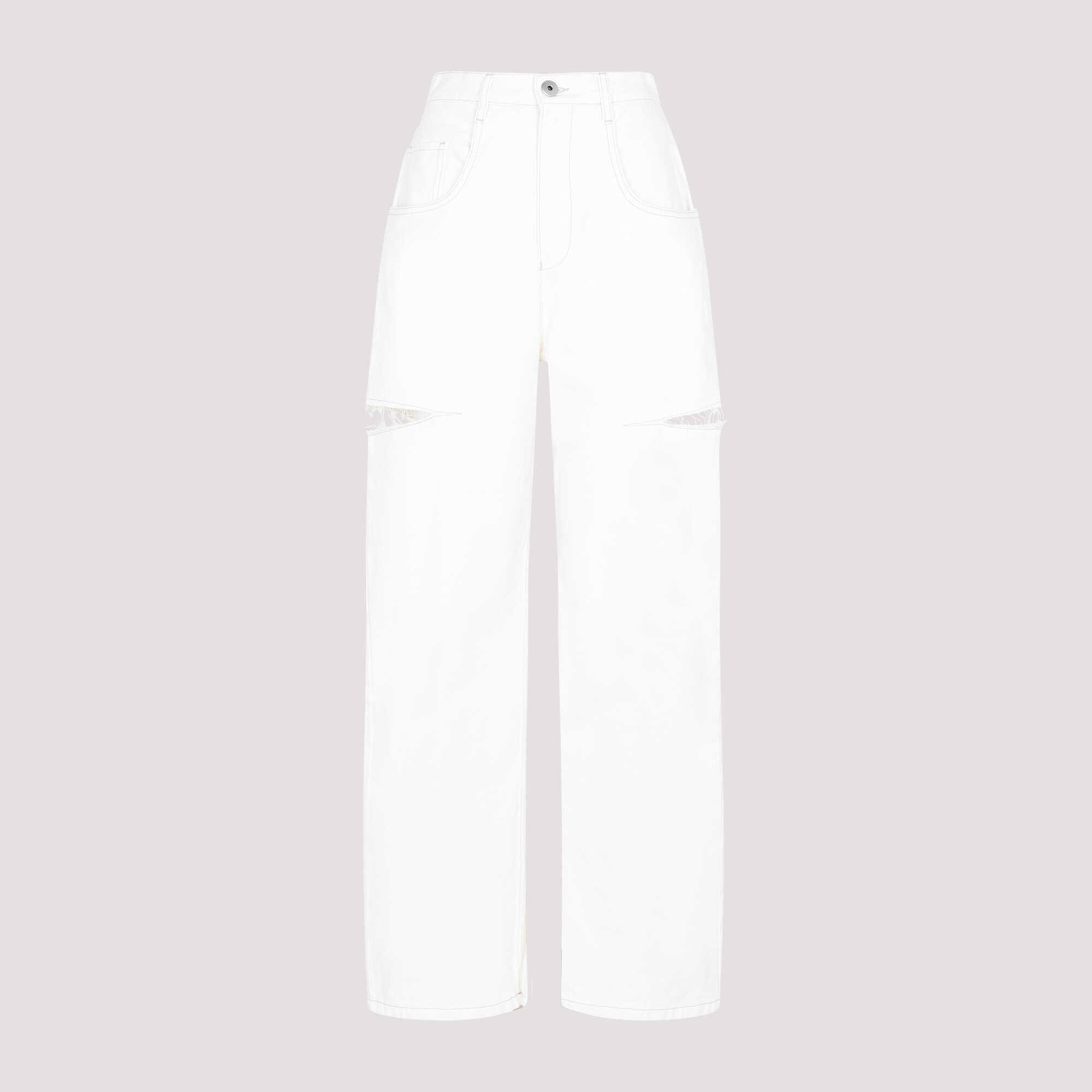 Elevate your wardrobe with these Maison Margiela white cotton jeans. Expertly crafted with a sleek design, they feature a concealed fastening, elongated pockets, and unique cut-out details. Perfect for any occasion, they blend style and comfort effortlessly.