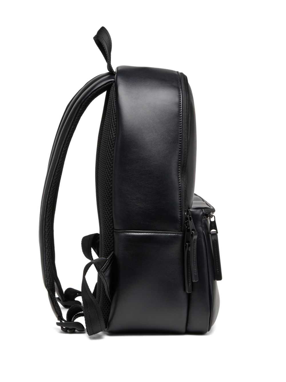 Diesel Medium Holi-D backpack Characteristics black artificial leather smooth grain top zip closure flat handle two adjustable padded shoulder straps oval plaque with D logo front zip pocket single compartment full lining internal zip pockets Composition Exterior: 100% polyurethane