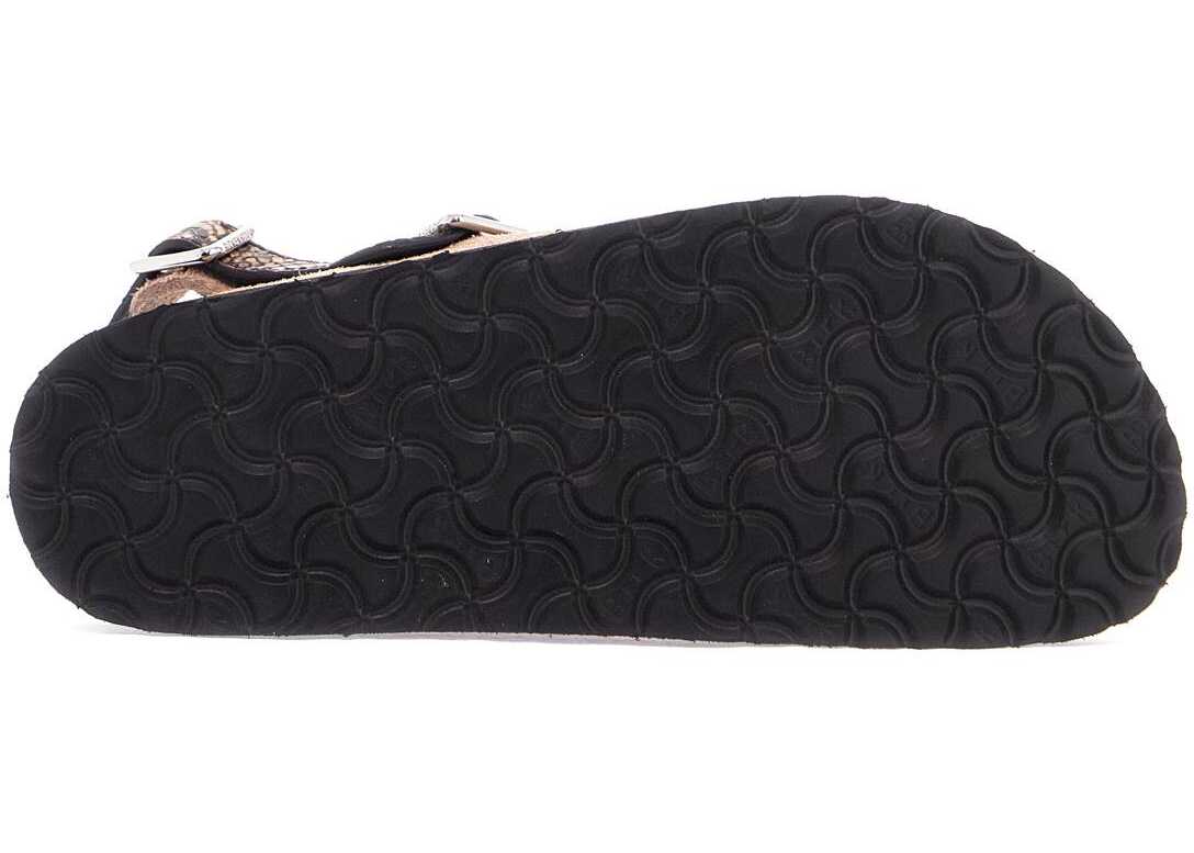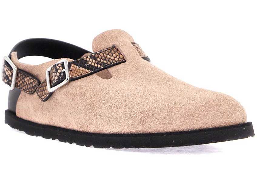 The Tokio II Lined clogs from the Birkenstock 1774 collection are made of suede leather and adorned with adjustable snake print leather straps. They feature an anatomical cork and latex footbed covered in leather, as well as a cut-out EVA sole.