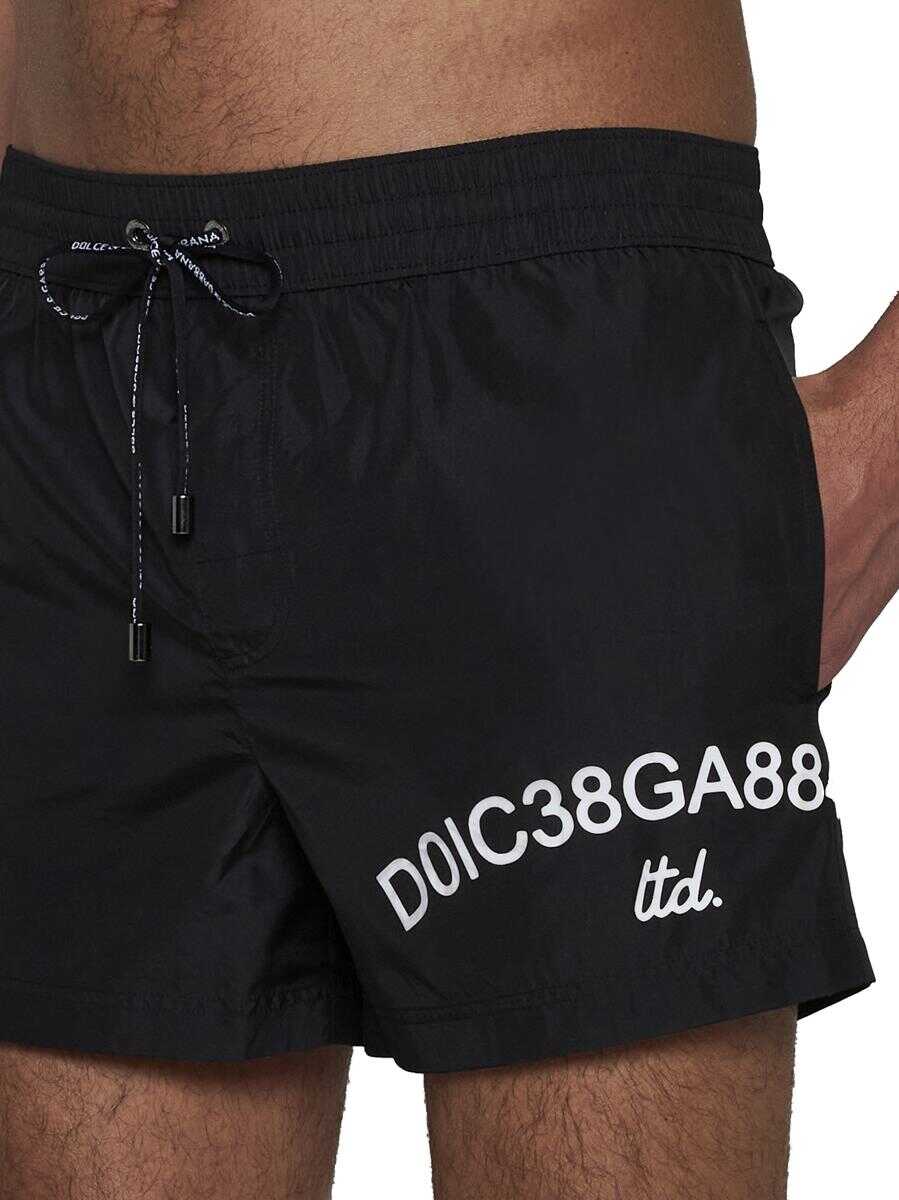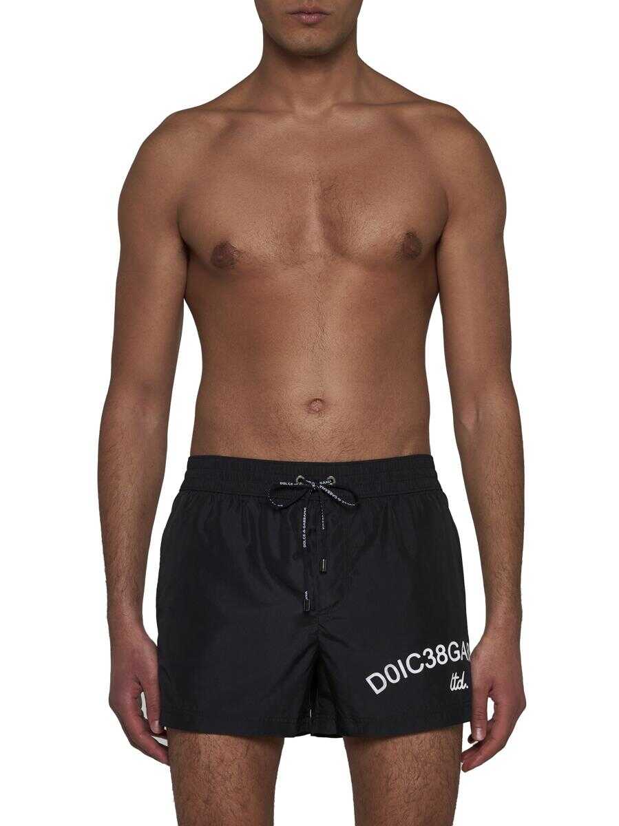 Dolce & Gabbana’s black nylon swim shorts featuring elasticated waist with logo-tape drawstring, logo printed on the leg, side pockets and back pocket.