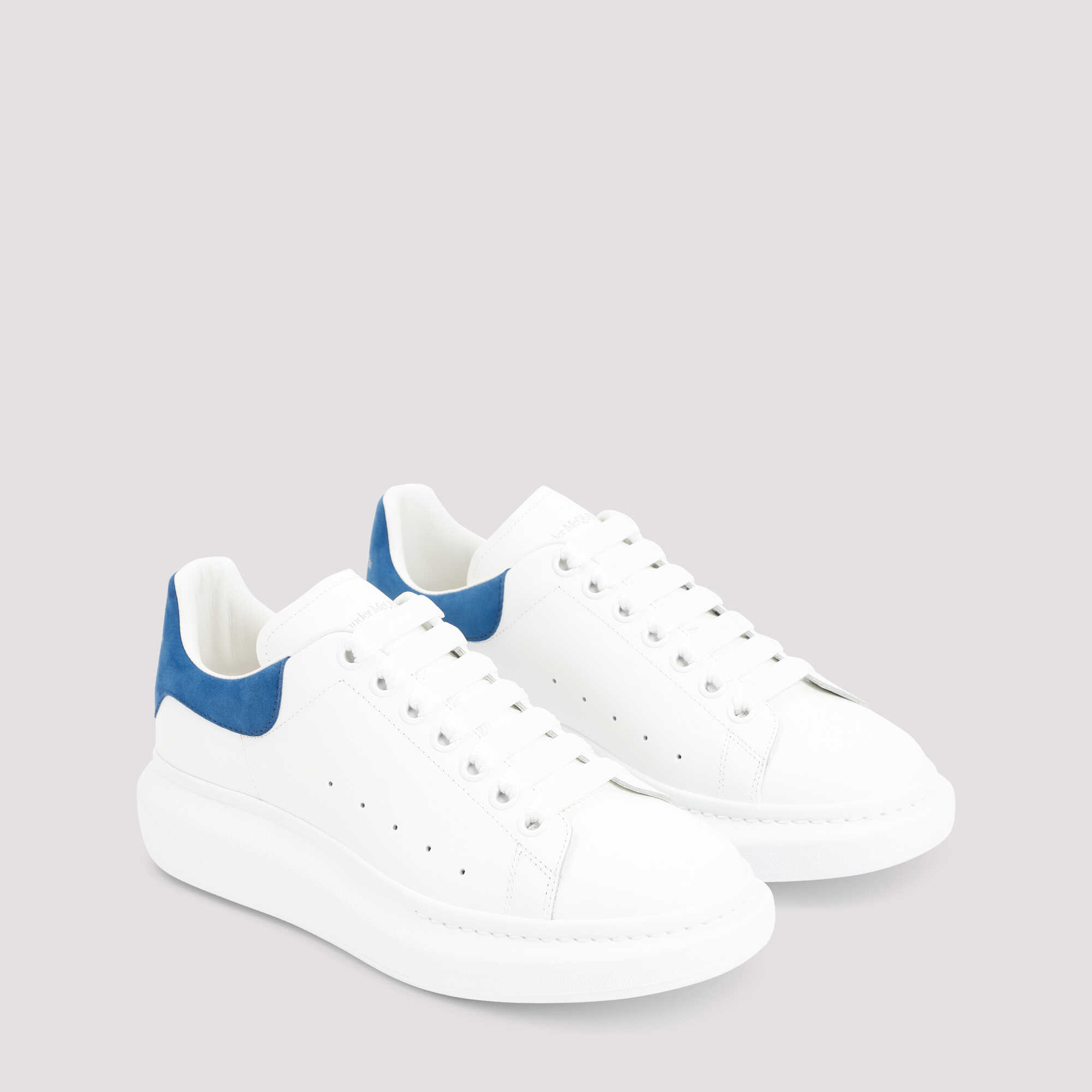 Alexander McQueen White Oversize Leather Sneakers. White leather upper, blue grain leather heel detail. Lace-up fastening, round toeline, rubber sole, logo details. Additional pair of white or white/blue shoelaces included.