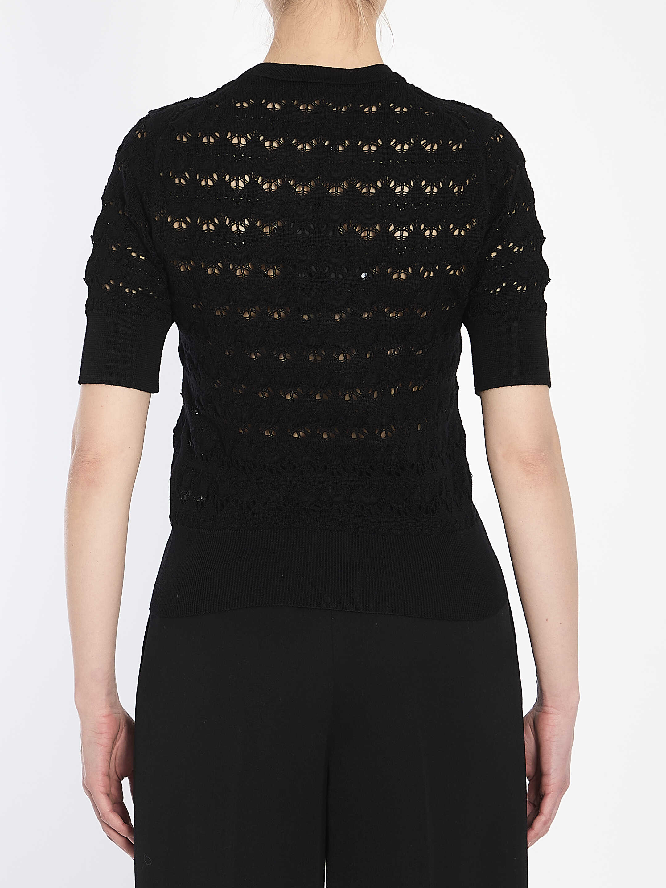 Black crochet wool cropped t-shirt with a crew neck and short sleeves. It features ribbed detailing on the neckline, hem, and sleeve edges.