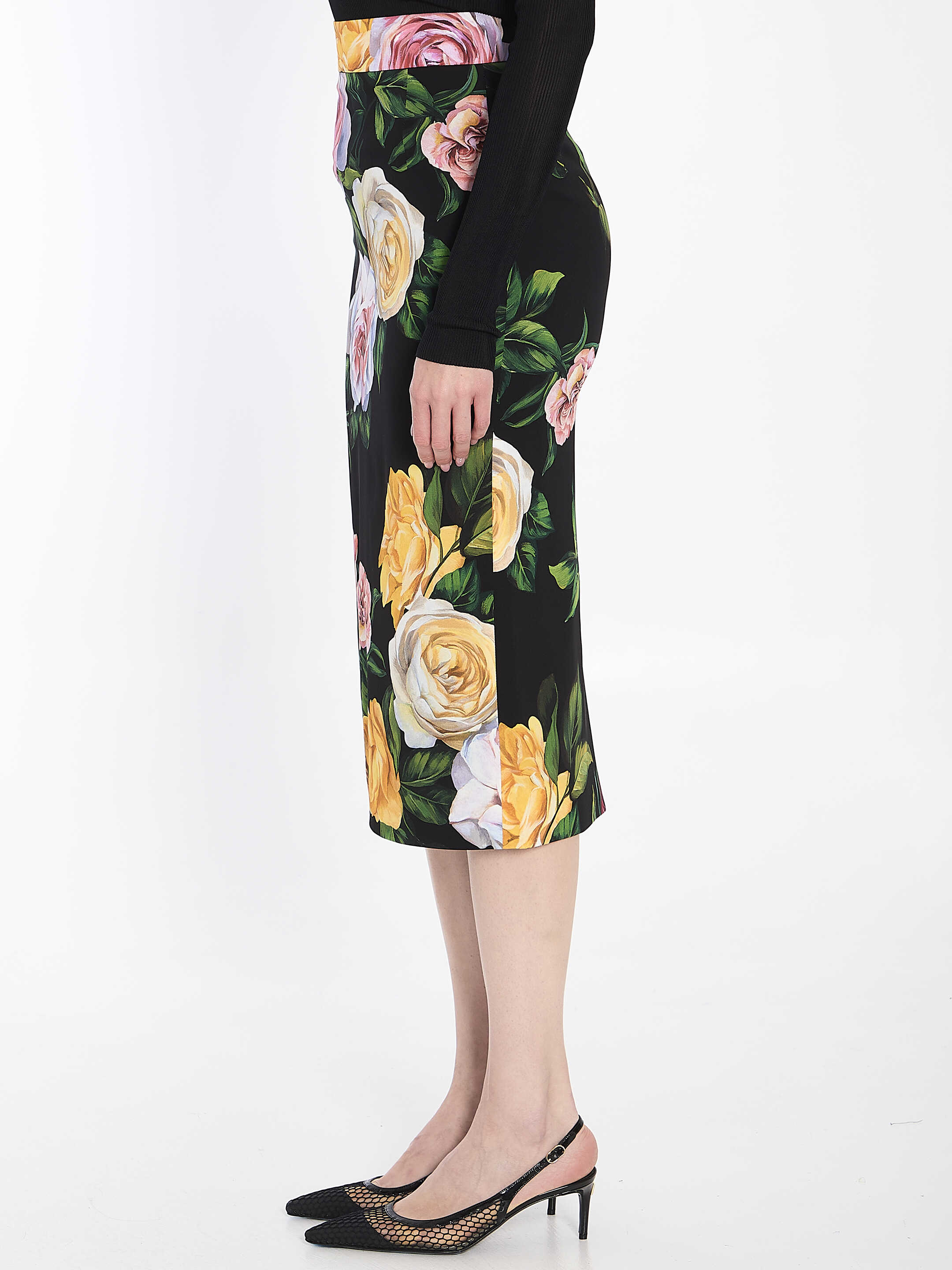 High-waisted pencil skirt in silk charmeuse with peony and rose print. It features logo lettering detail on the front, concealed zipper closure on the back and silk crepe de chine lining. Tight fit.