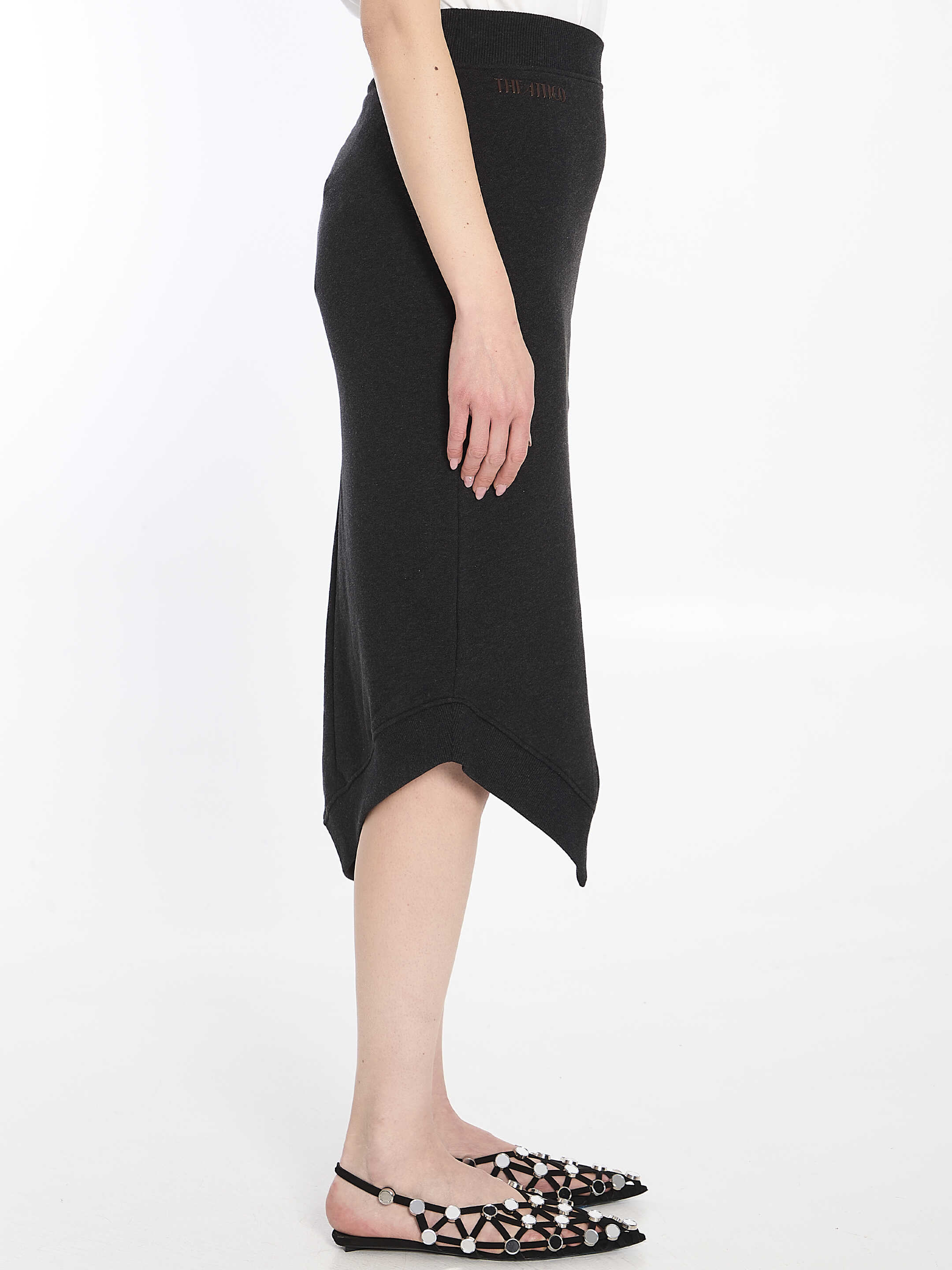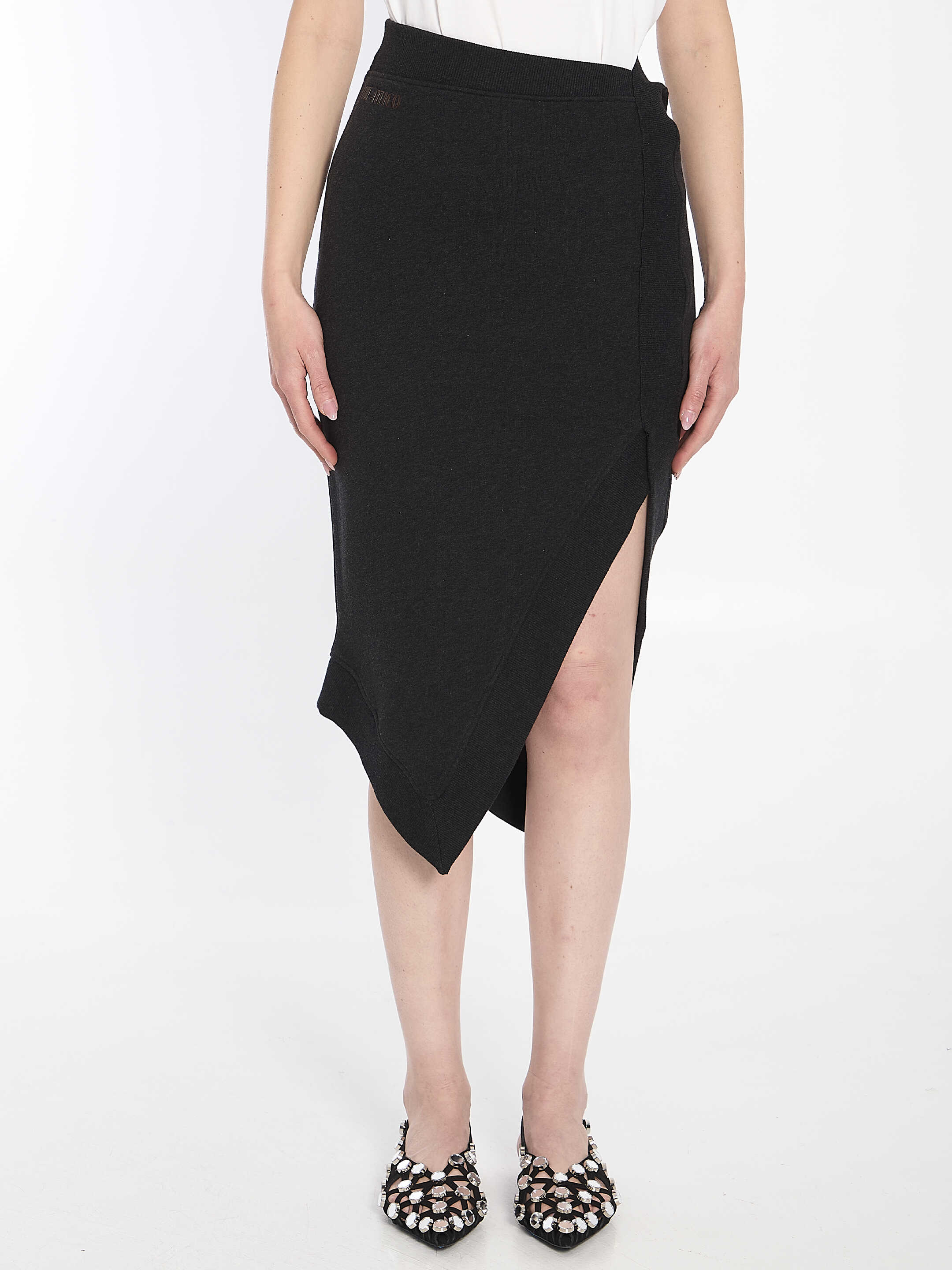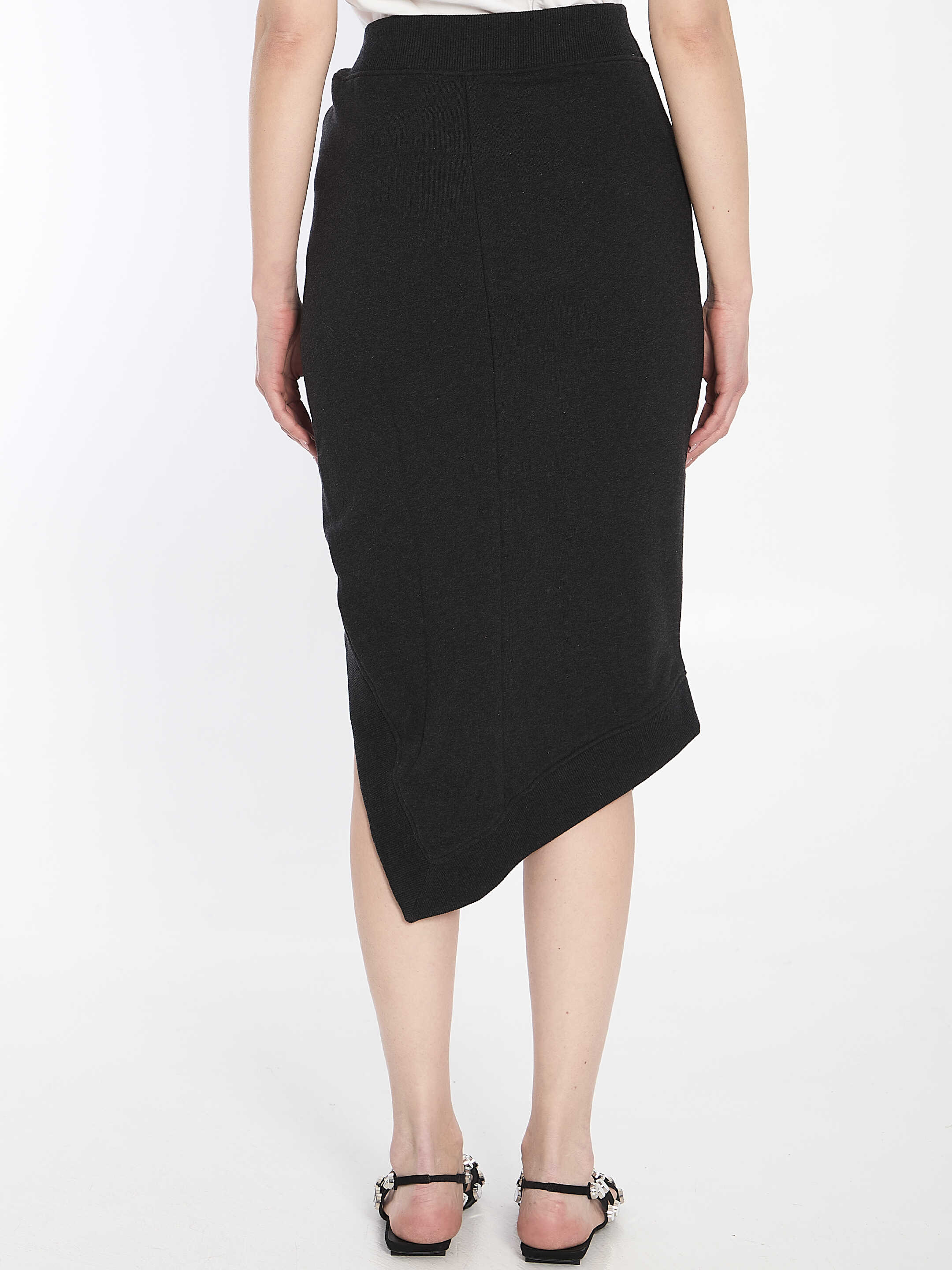 Midi skirt in double black fade and brown American fleece. It features a front slit, elasticated waistband, brown raised rubberized logo print on the front, asymmetrical hem, and contrasting brown interior. Regular fit.