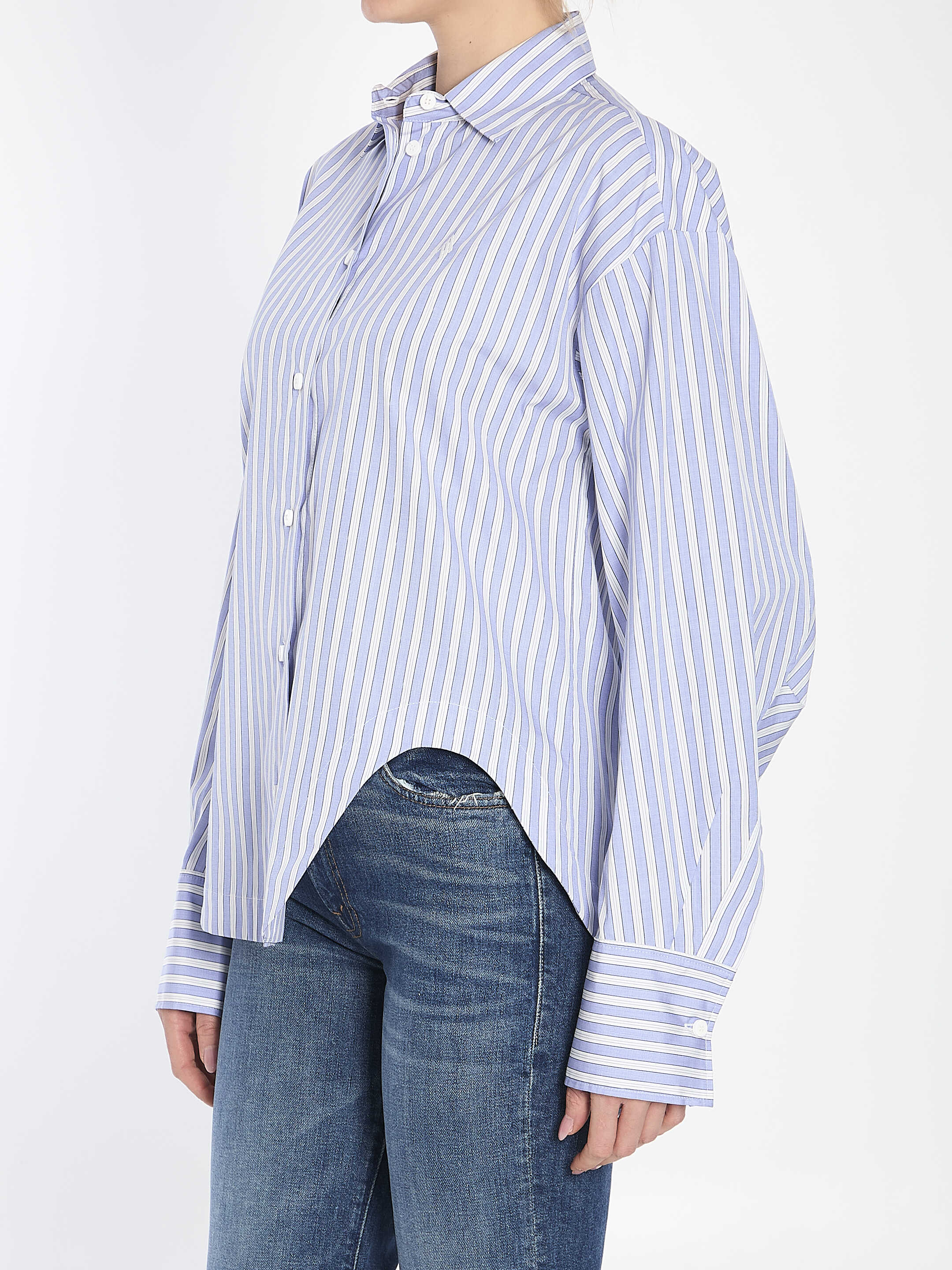 Eliza shirt in white and blue striped cotton. It features a button closure, pointed collar, shaped front slit, white embroidered logo on the chest, and button cuffs. Regular fit.