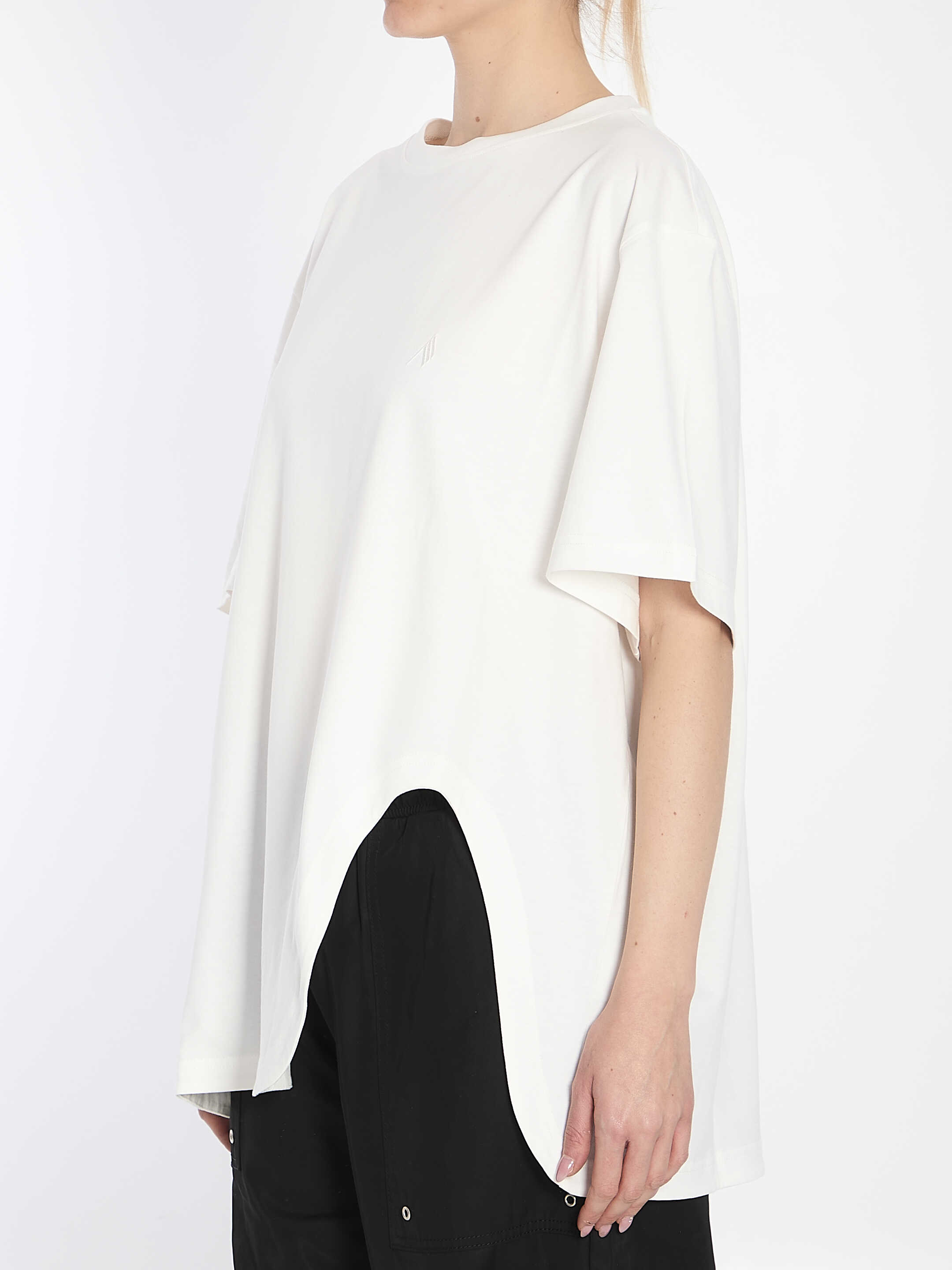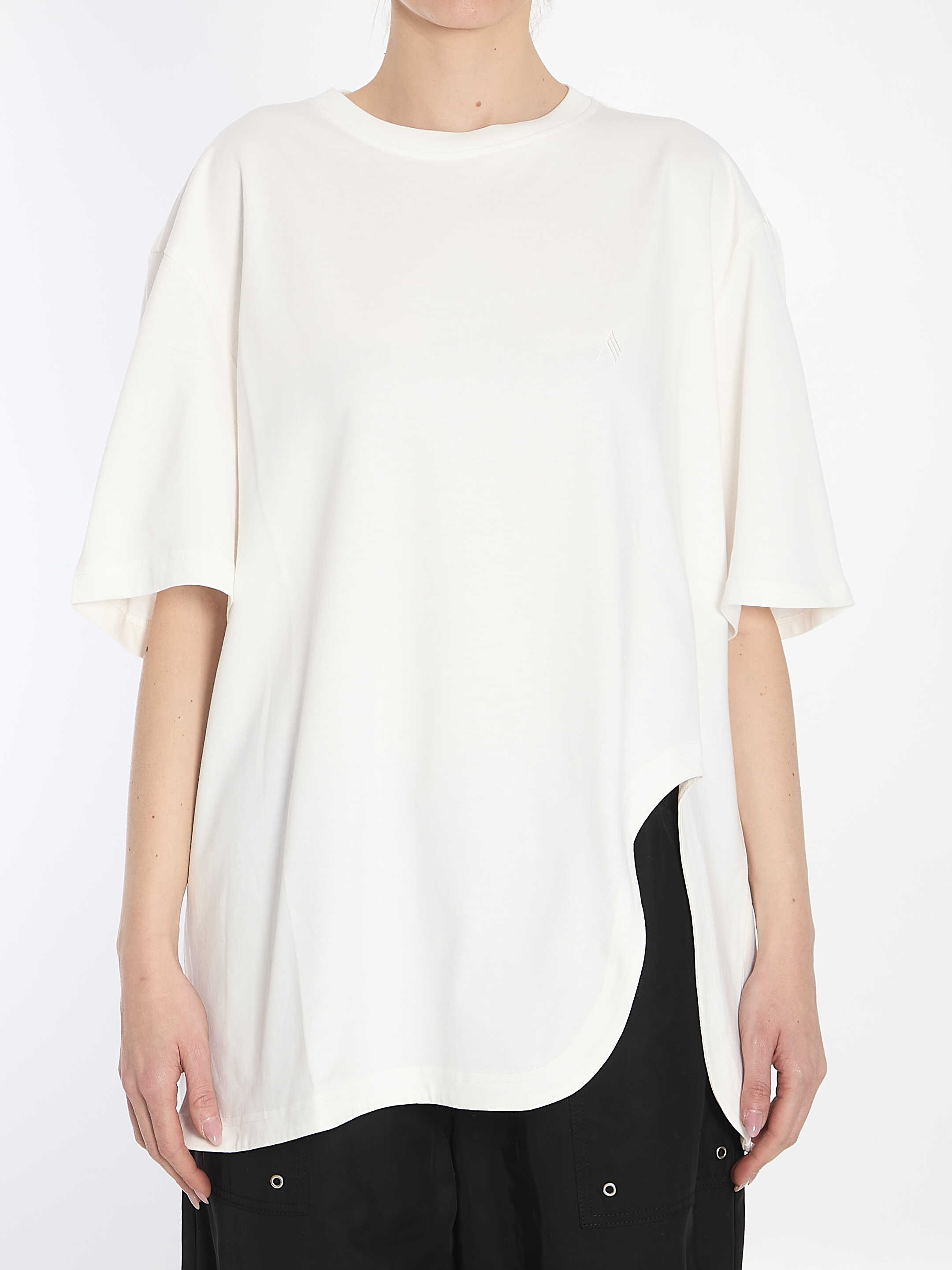 Short-sleeved crew neck oversize t-shirt in white cotton jersey. It features a shaped split on the front, tonal The Attico logo embroidered on the chest and trim neck. Oversized fit.