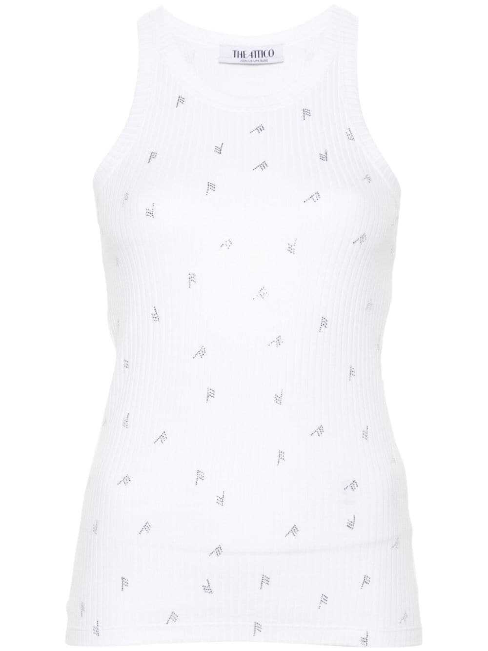 Elevate your wardrobe with The Attico Top in White. Made from 100% Cotton with stunning Strass details, this T-Shirt is a must-have for any fashion-forward woman. Perfect for a casual day out or a night on the town, this top effortlessly combines comfort and style in one chic piece. Add a touch of luxury to your look with The Attico.