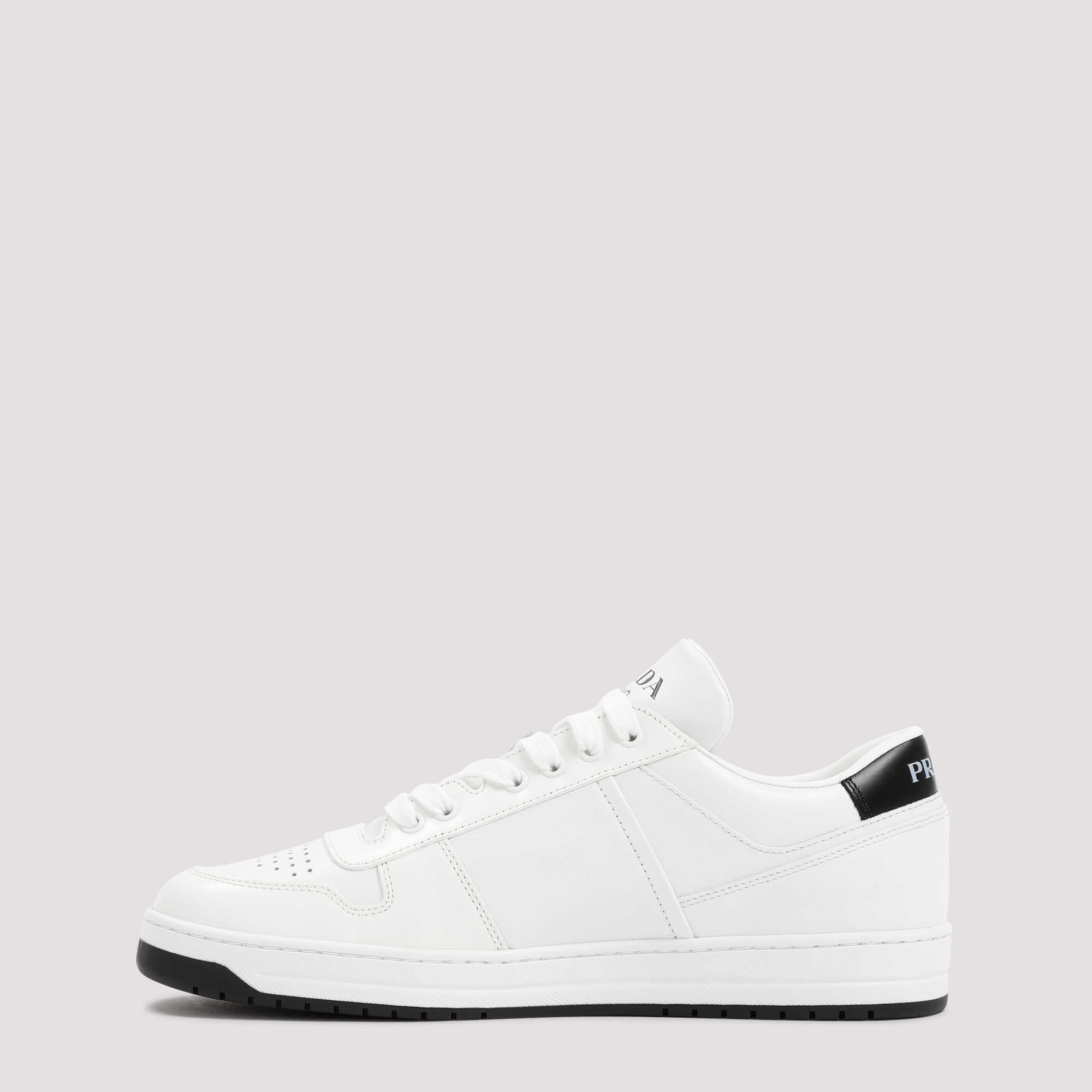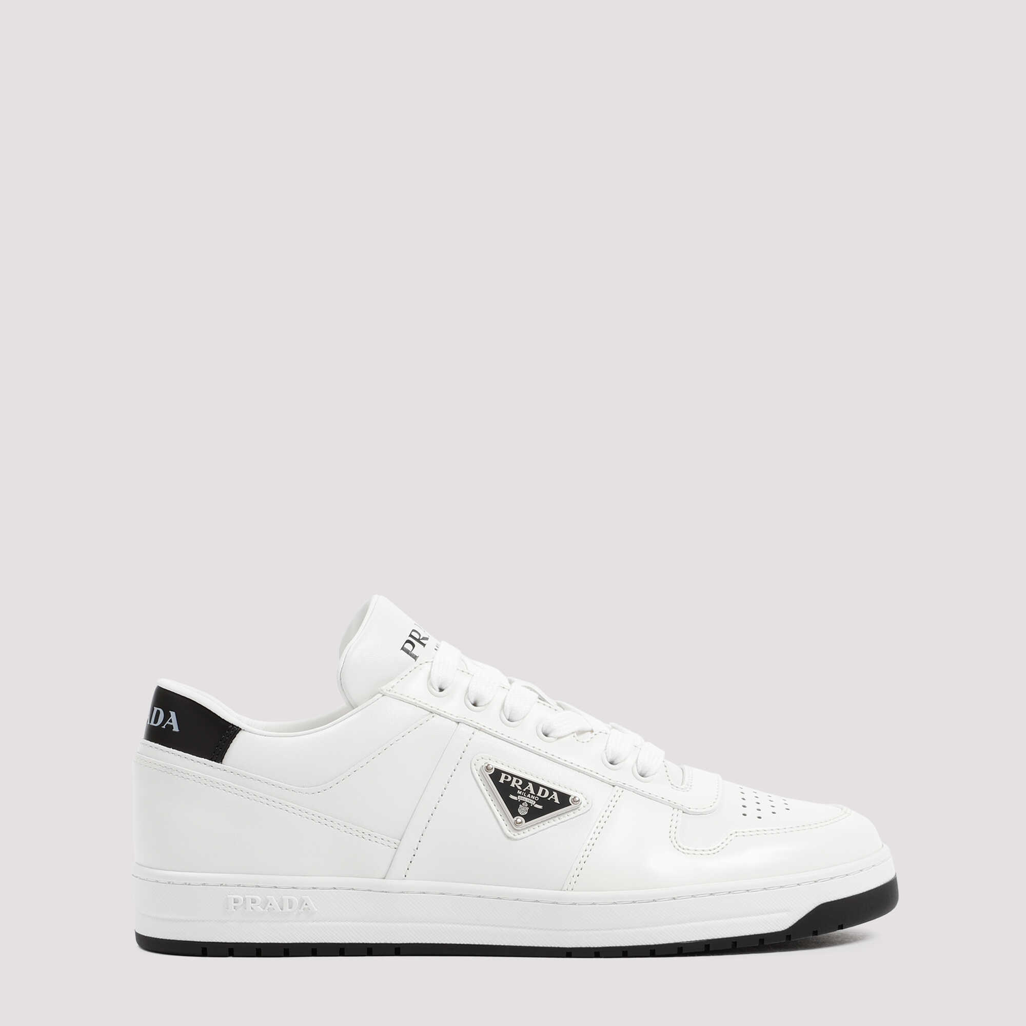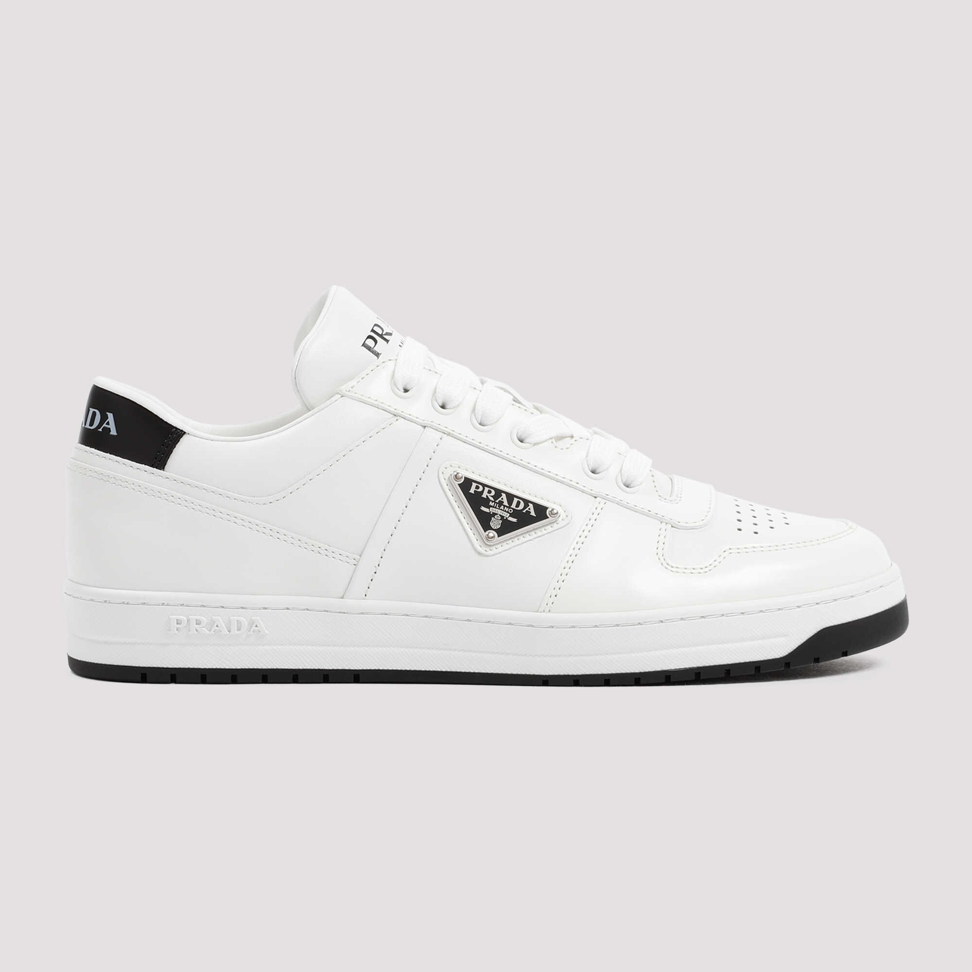 Prada White Leather Downtown Sneakers. White leather upper, perforated details, classic lace-up fastening, triangle logo on side, printed logo on heels and on tongue, rubber sole, regular fit.