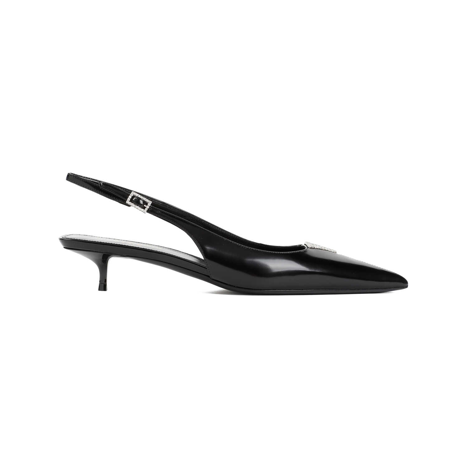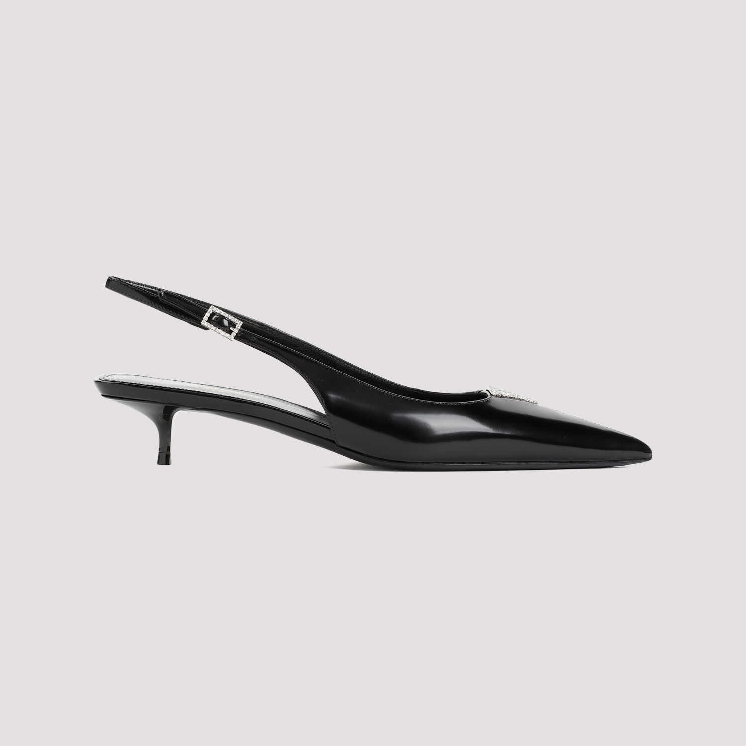 Elevate your look with these stunning black brushed leather pumps from SAINT LAURENT. Featuring a pointed toe, triangle crystal detail, and an adjustable ankle strap with a silver-tone buckle. The thin heel adds a touch of sophistication. Perfect for any occasion.