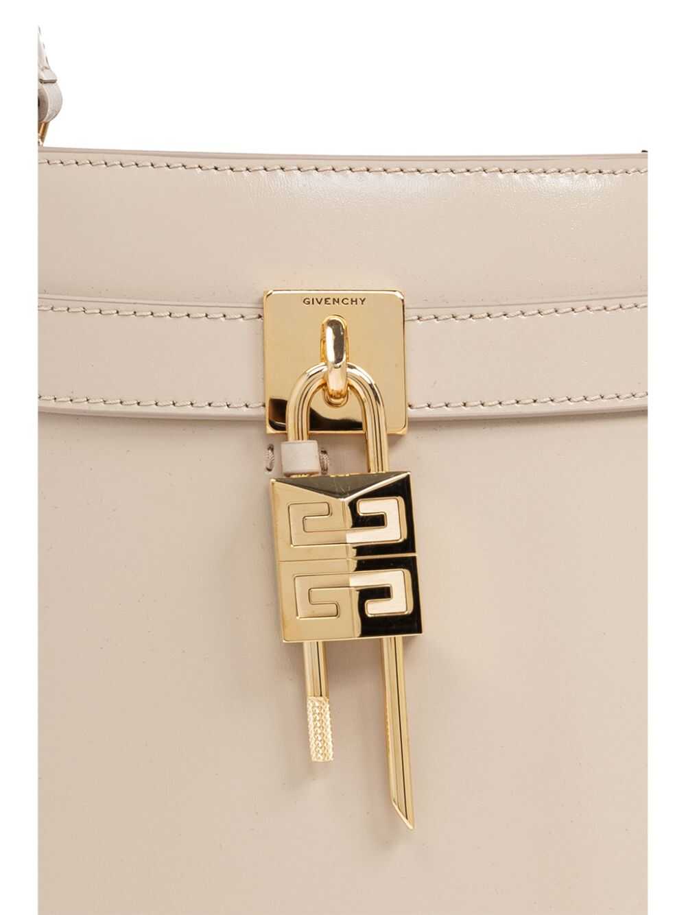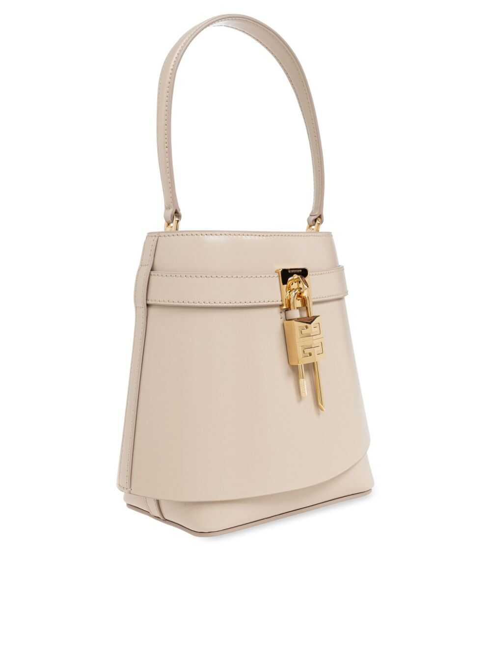 Givenchy Shark Lock bucket bag Origin: Italy Characteristics beige calfskin smooth grain open top removable handle removable shoulder strap gold-colored details padlock detail engraved logo single compartment full lining internal print with logo internal patch pocket