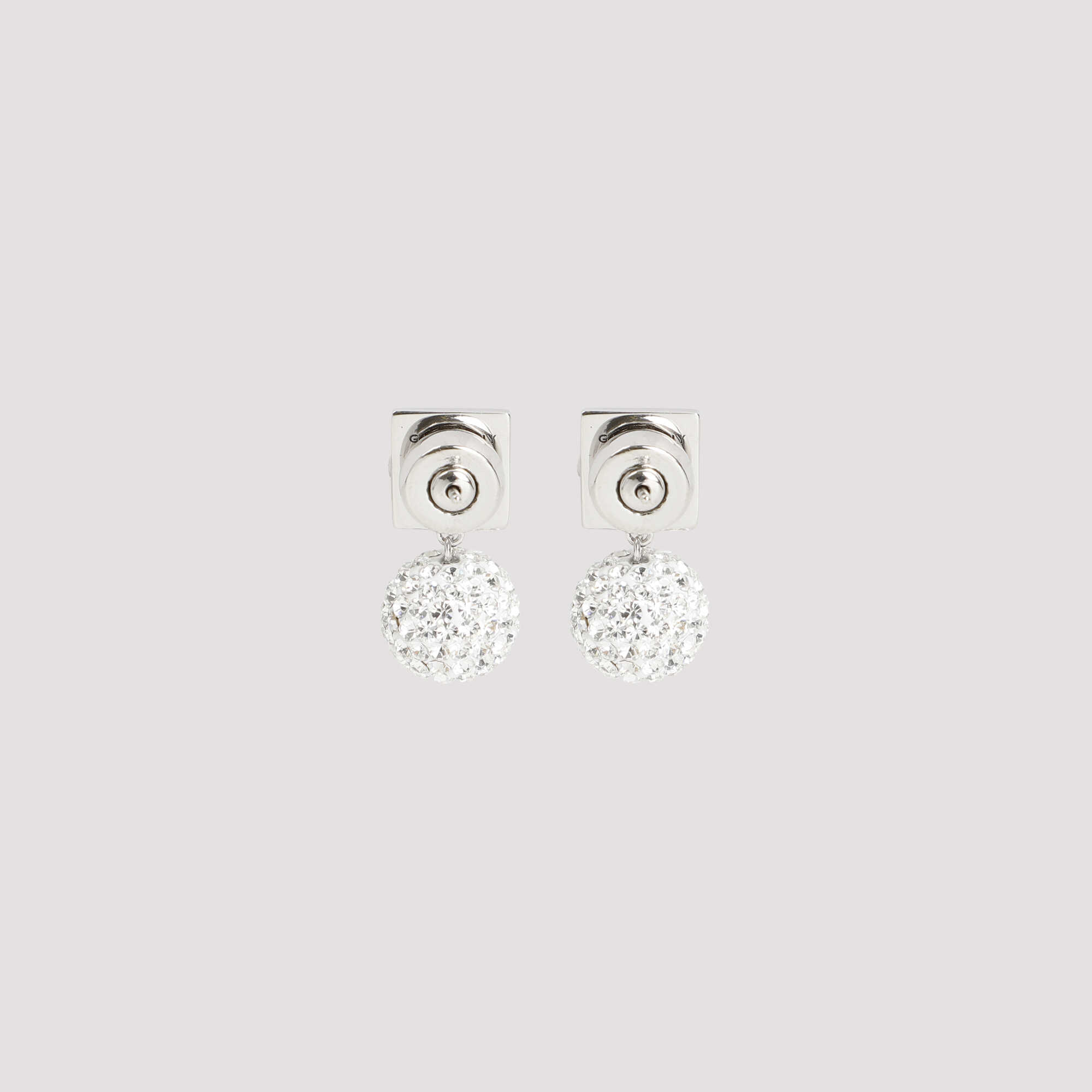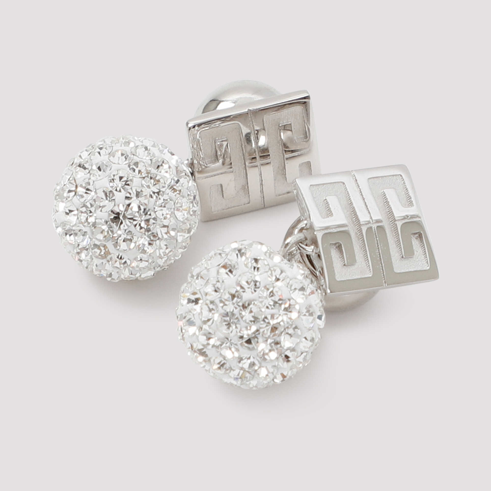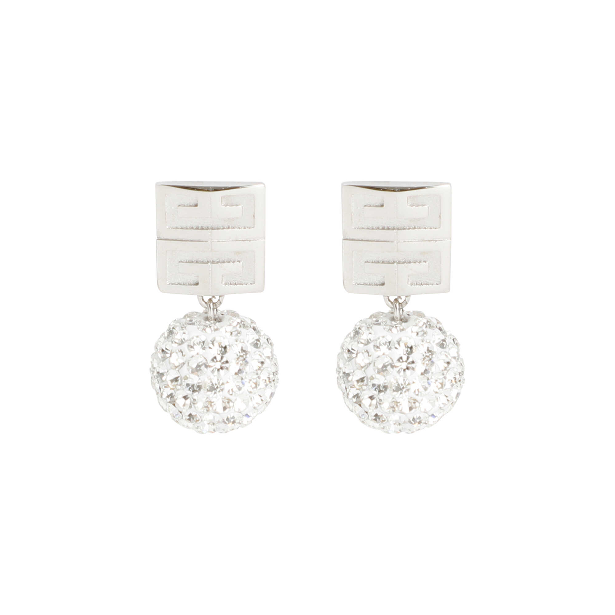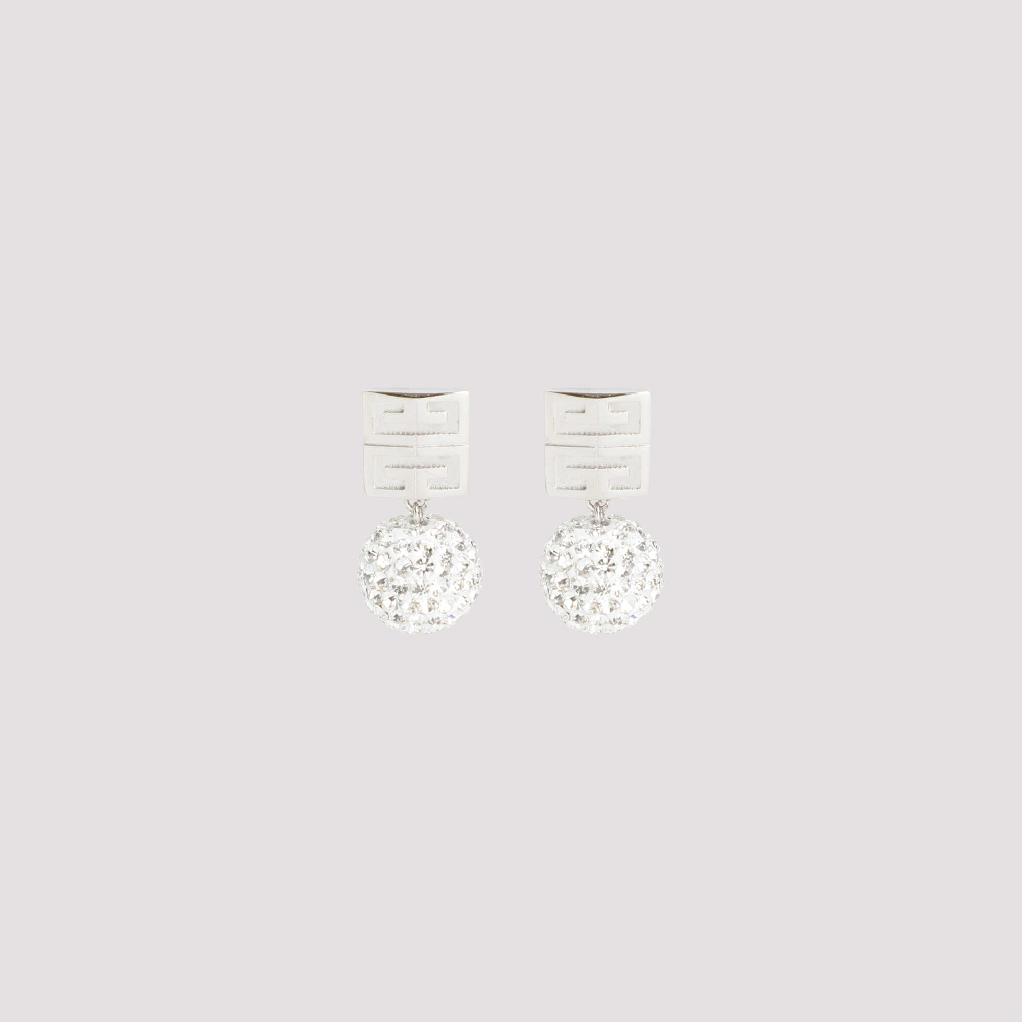 Givenchy Silver 4G Crystal Earrings. Crafted in pure silver-toned brass. "4G" logo stud, round crystal embellished pendant, friction back fastening.