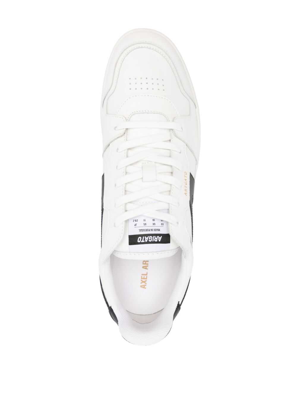 Axel Arigato Dice sneakers with inserts Characteristics white/black calfskin design with color-block inserts round tip perforated detail side logo print logo application on the tongue Contrasting heel reinforcement with logo padding in the ankle insole with WS logo mesh lining flat rubber sole front closure with laces Protect your purchases. This item comes with a protective dust bag.
