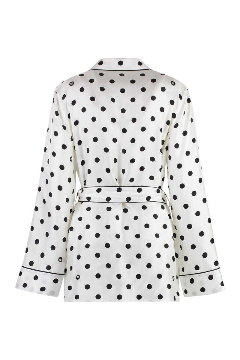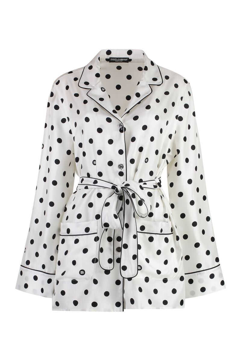 'Mambo' pajama shirt in polka dot print silk twill with button closure, matching waist belt, long sleeves, pockets