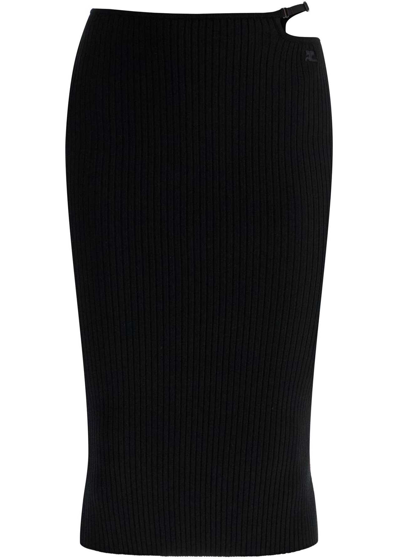 The COURREGES midi skirt offers timeless elegance. Slim fit high waist with vertical ribs in viscose and polyester. Versatile and refined for sophisticated looks day and night.