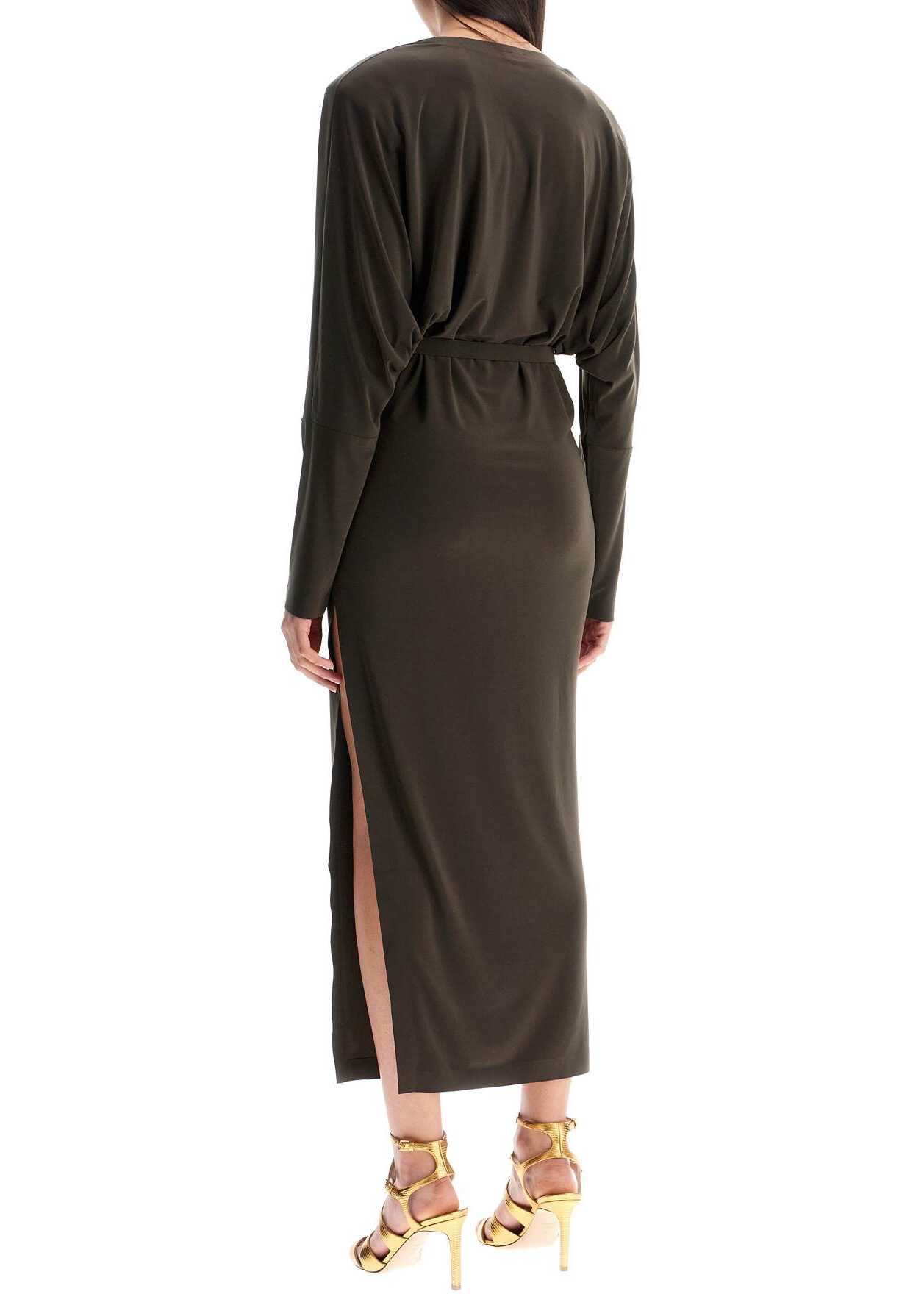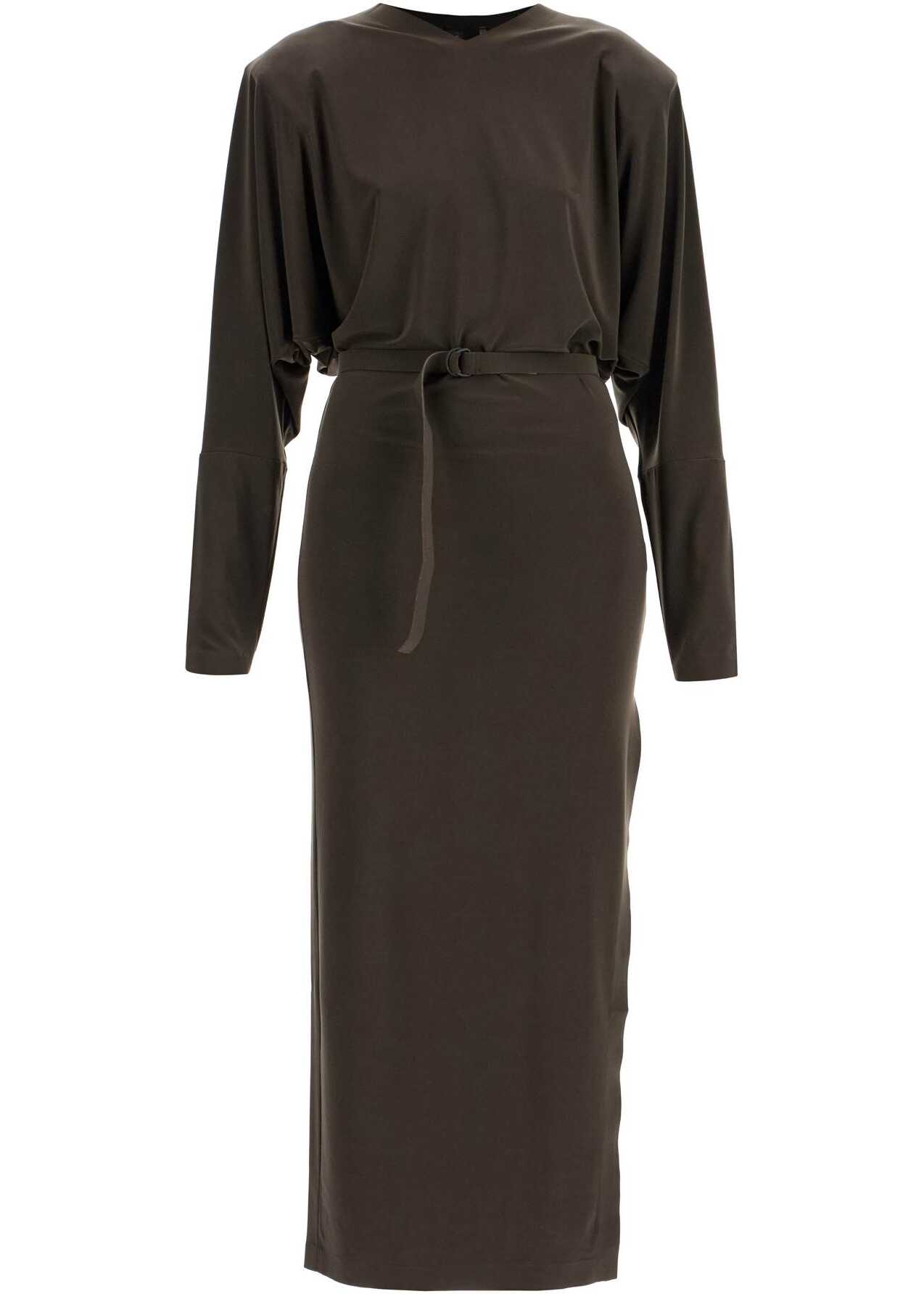 Brown Long Dress by NORMA KAMALI embodies timeless elegance. Innovative fabric, V-neckline, long sleeves, and side slit. Perfect for special occasions, combining comfort and sophisticated style.