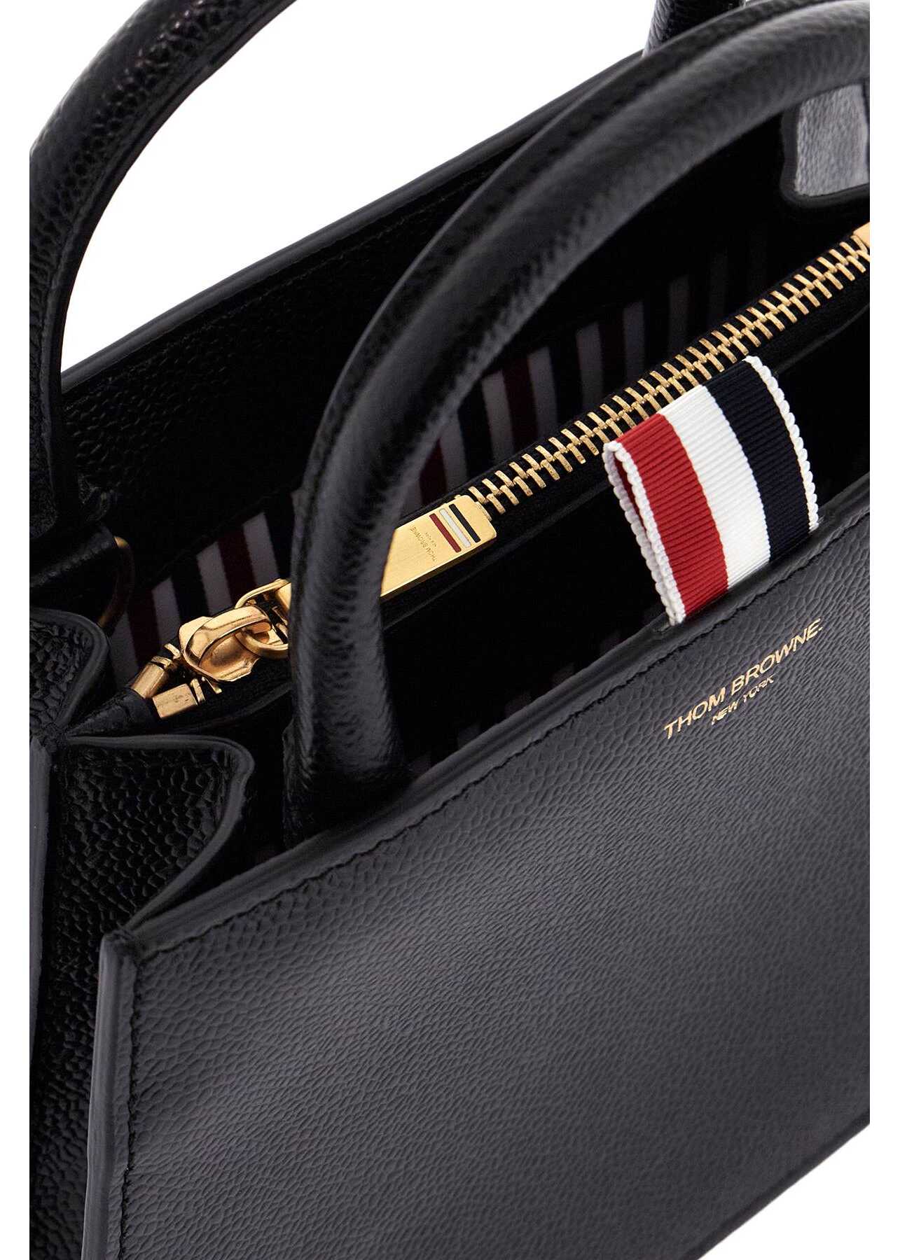 Borsa a mano Thom Browne realizzata in pelle martellata, caratterizzata dalla struttura rigida a trapezio e rifinita con iconica linguetta in gros-grain tricolore. Il design presenta due scomparti a soffietto divisi da una tasca con zip e una tracolla aggiuntiva regolabile. Accessori in metallo finitura oro.