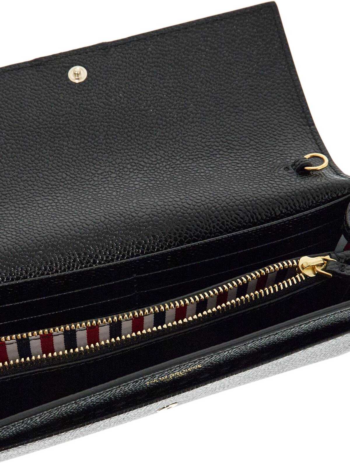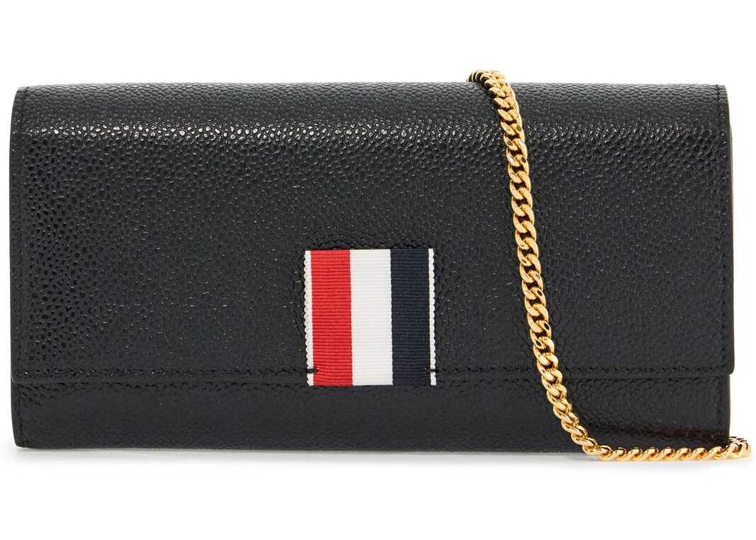 The Thom Browne chain wallet combines elegance and functionality. Made of calfskin with a removable gold chain and tricolor ribbon, it offers versatility for every occasion with refined style.