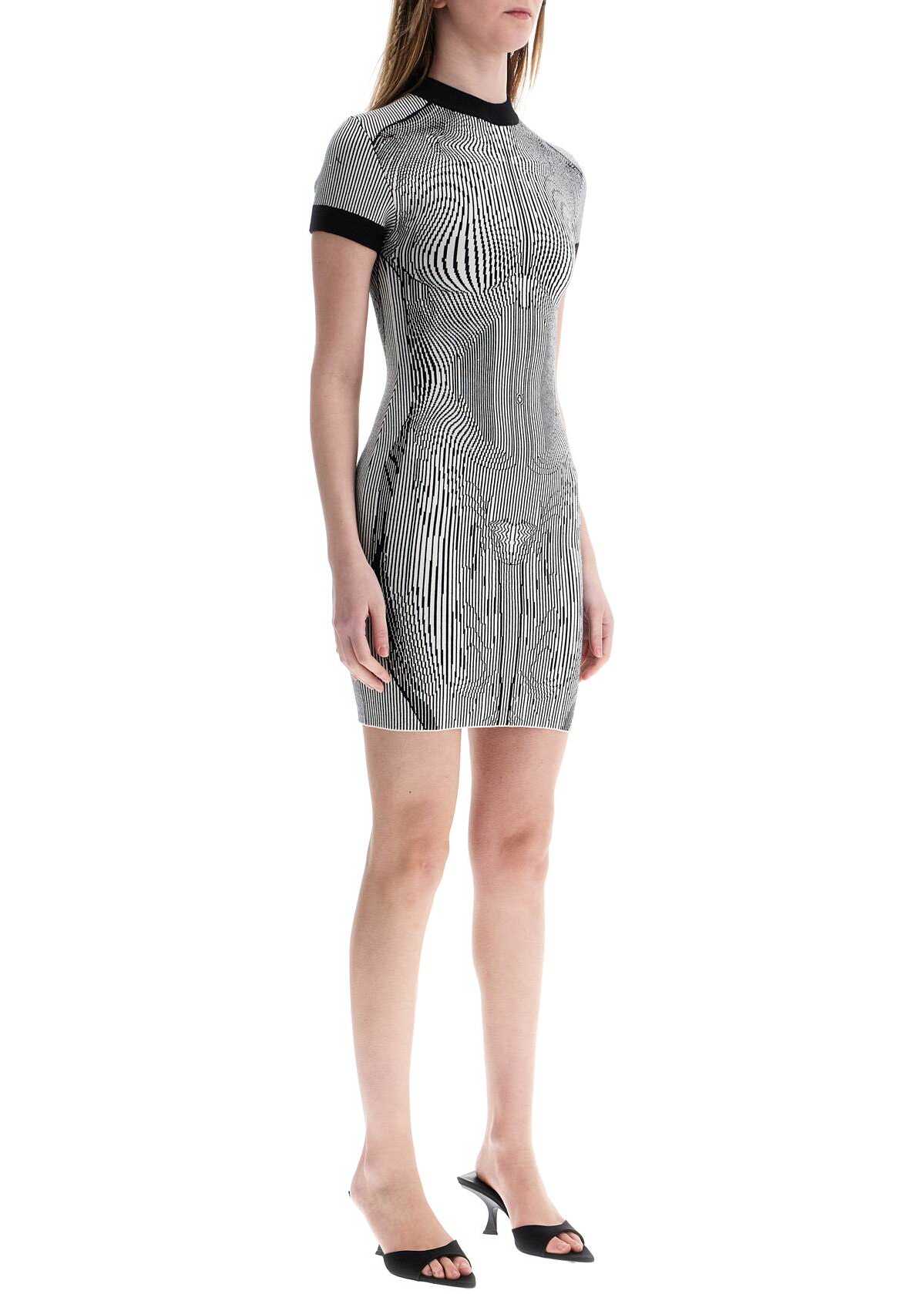The 'Morphing Pinstripe' short dress by Jean Paul Gaultier embodies spring-summer style. In jacquard viscose with black and white stripes, it offers comfort and elegance Made in Italy.