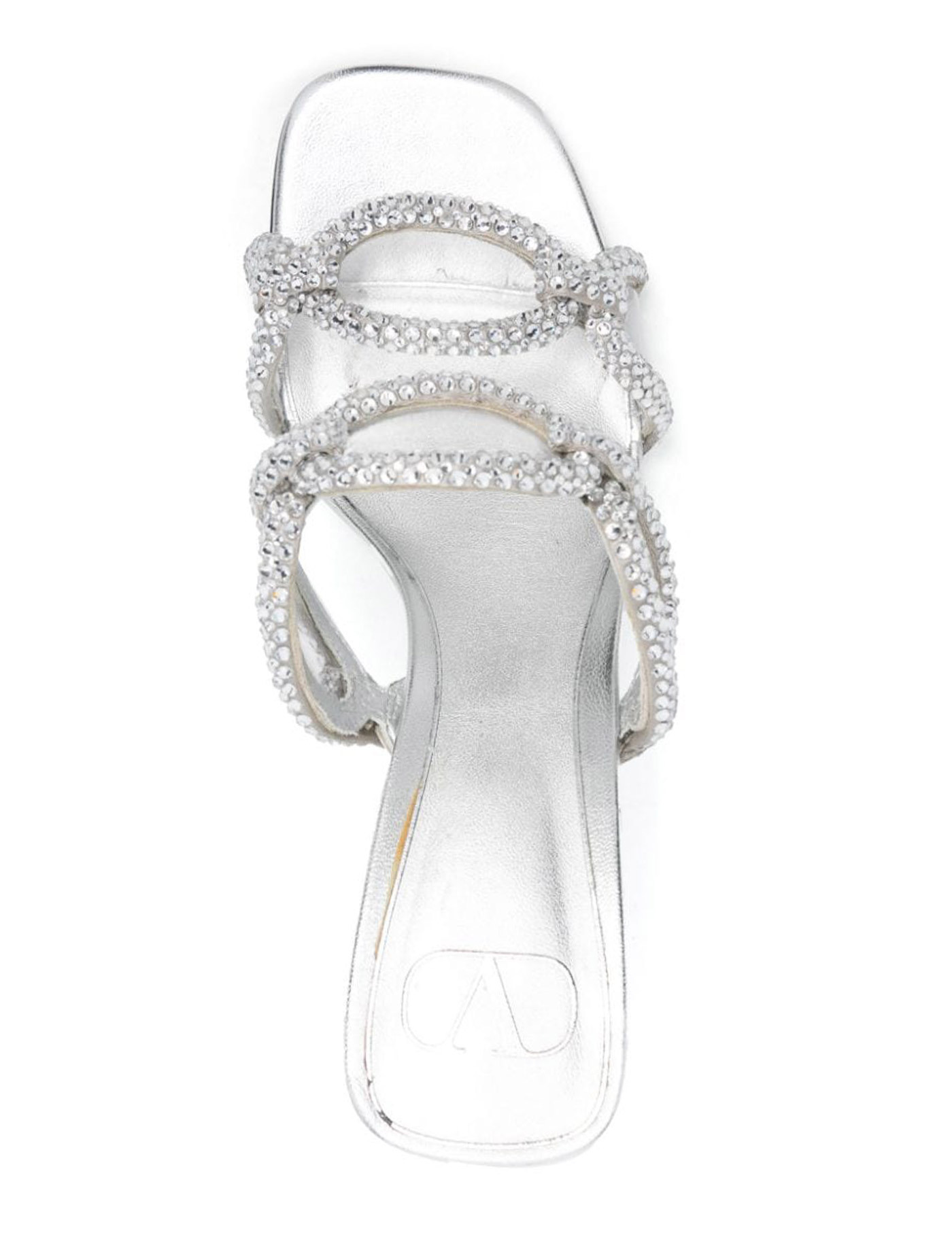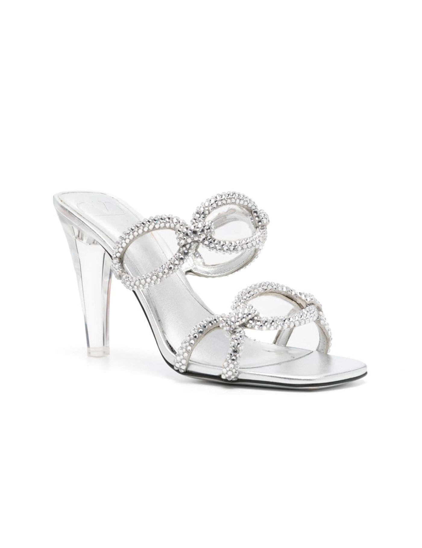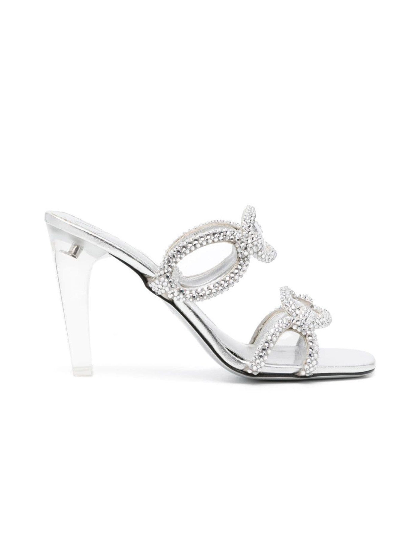 Valentino Garavani Chain 1967 Slide sandals in silver-tone metallic nappa leather with transparent polymer material heel. Straps with 3D chain motif and crystal appliqués.