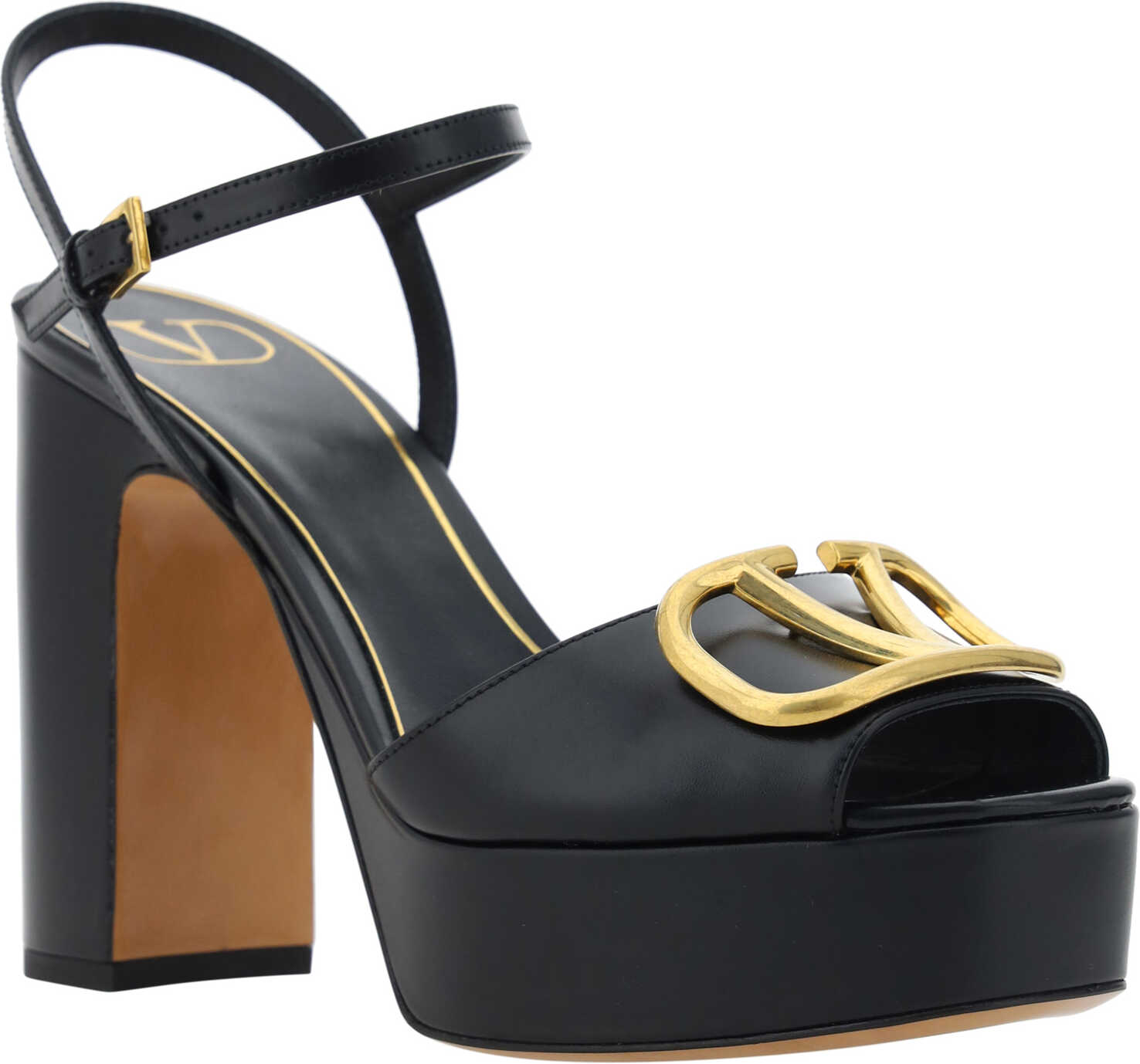 Valentino Garavani's leather Sandals feature a sleek, modern design with a wedge pattern and geometric heel for comfort and style. The buckle closure around the ankle ensures a secure and customizable fit. The front strap is embellished with the applied three-dimensional VLogo detail, a distinctive symbol of the brand.